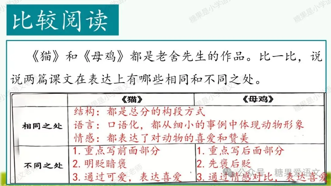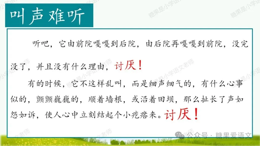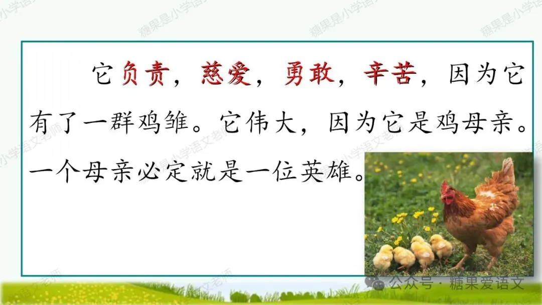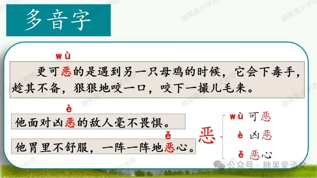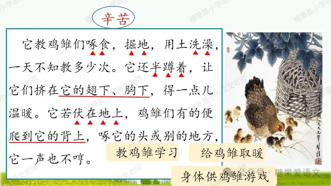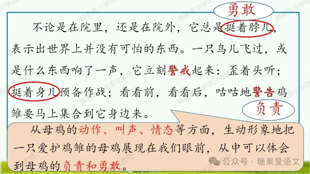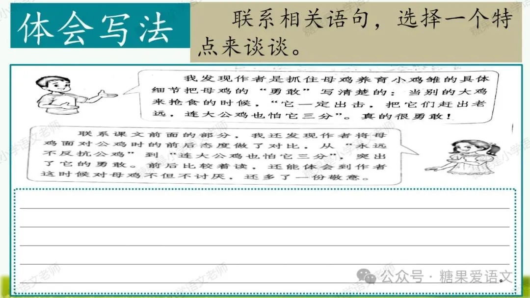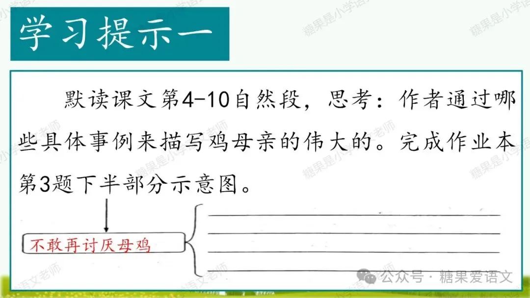 14.母鸡教学目标:1.认识“疙、瘩”等9个生字,读准多音字“恶”,会写“讨、厌”等15个字,会写“理由、心事”等10个词语。 2.默读课文,了解“我”对母鸡态度前后的变化,并说出变化的原因。 3.感受母鸡的“负责、慈爱、勇敢、辛苦”,体会母爱的伟大。 4.通过比较,感受同一作家在写不同动物时,表达上的相同和不同之处。 教学重难点: 体会作者对母鸡态度的变化,感受母鸡的特点。 教学安排:2课时 教学准备:ppt 教学流程: 第1课时教学目标:1.认识“疙、瘩”等9个生字,读准多音字“恶”,会写“讨、厌”等15个字,会写“理由、心事”等10个词语。 2.默读课文,了解“我”对母鸡态度前后的变化。 3.重点学习1-3自然段,了解母鸡令人讨厌的原因。 教学过程: 一、走进文本,初识母鸡1.孩子们,这个单元我们走进了“我的动物朋友”,认识了古怪的大猫和淘气的小猫。这节课呀,我们要一起走进老舍先生另一篇描写动物的散文《母鸡》,请同学们来读课题。 课件出示:课题 2.通过预习,你们知道老舍先生对母鸡态度是怎么样的? 预设:刚开始是很讨厌的,后面不敢讨厌了。 是啊,文中有这样两句话直接表达了他的的情感,我们一起来读。 课件出示: 我一向讨厌母鸡。 我不敢再讨厌母鸡了。 是的,起先是一向讨厌,后来不敢再讨厌了,怎么回事呢?出示:问号 赶紧打开书读读课文,找找老舍先生对母鸡的态度180度大转变的原因。 二、初读课文,字词过关1. 请同学们自由朗读课文,边读边圈画生字新词,把课文读得正确、流利、有感情。边读边思考:课文围绕“母鸡”主要写了什么? 课件出示: 1.自由朗读课文,边读边圈画生字新词,把课文读得正确、流利、有感情。 2.边读边思考:课文围绕“母鸡”主要写了什么? 2. 我们来读读这些生字。 课件出示:检测字词 请你读一读第一组词语,说说你发现了什么? 预设:第一组都是形容母鸡啼叫的词语。 预设:“嘎嘎、咕咕”都是拟声词; 预设:“颤颤巍巍、如怨如诉”都是形容母鸡叫声的状态。 补充:文中像“如怨如诉”这种ABAC形式的词语:没完没了、细声细气,也是形容母鸡的叫声的。 请同学们读一读,感受母鸡的啼叫声。 第二组词语呢? 预设:第二组词语都是儿化音。 是啊,老舍先生是北京人,他的很多文章里都带有儿化音,我们试着读好它。 这里还有一个多音字,谁能来读读。 课件出示:多音字 现在请同学们完成作业本练习。 课件出示:作业本第2题 3.现在让我们回到课文,从开始的“一向讨厌”到后来的“不敢再讨厌”,老舍先生对母鸡的态度是从哪里开始变化的呢? 预设:第4自然段(课件横线画出) 追问:你发现了什么? 预设:是过渡段,在文中起到承上启下的作用。 找到了过渡段,还有首尾的关键句,课文的结构便清晰地展现在我们眼前,你还发现了什么? 预设:前面的三个自然段写作者讨厌母鸡,从第4自然段开始到末尾,写作者不敢再讨厌母鸡。课件出示:框出1-3自然段,动画框出4-10自然段 看看画横线的三句话,谁能说说课文围绕“母鸡”写了什么? 预设:作者本来很讨厌母鸡,但他看见一只孵出一群鸡群的母鸡,他对他一开始很讨厌的母鸡,但是看到这只母鸡后他改变了他的心思,变得不再讨厌母鸡了。 小结:是啊,抓住了关键句,我就能这么长的文章读成几句话,我们在概括主要内容的时候就可以用上这样的方法。 三、研读段落,感悟“讨厌”1. 老舍为什么讨厌母鸡?我们先来研读课文的第1-3自然段。请大家默读第1-3自然段,找找作者讨厌母鸡的原因,完成作业本第3题上半部示意图。注意:默读要做到不出声,不指读,圈点勾画。 课件出示: 默读第1-3自然段,找找作者讨厌母鸡的原因,完成作业本第3题上半部示意图。 2. 交流展示,体会“讨厌” 好的,孩子们。我们一起来交流,作者讨厌母鸡的是第一件事是什么?请同学们跟我看到第一自然段。 预设:母鸡的叫声很不好听,也是无病呻吟。 点拨:好的,第一件事情,孩子们找到了一只叫声难听的母鸡。接着来,作者讨厌母鸡的第二件事是? 预设:它永远不反抗公鸡,而且这只母鸡它非常的欺软怕硬。 预设:第三件事是说这只母鸡是一只人群中炫耀显摆的母鸡。 师:孩子们,你们看三个段落的三件事情。你们的作业本都填对了吗?意思相近即可。 课件出示:作业本第3题上半部分答案 3.咱们一件一件来看,先听听这叫声有多难听。请同学们自由朗读课文第1自然段,请同学们来交流学习体会。 (1)母鸡的叫声是怎样的? 预设:嘎嘎。动画圈出嘎嘎 咱们来听听这嘎嘎声是什么样子的。(播放音频)什么感觉? 预设:很烦人感觉。 预设:感觉很烦躁。 点拨:这烦躁的叫声,在你吃饭的时候的叫,在你写作业的时候它在叫,在你睡觉的时候它还在叫,一个词叫? 预设:没完没了。课件圈出没完没了 这没完没了的嘎嘎声,真是讨厌。你能借助下面的句式说说吗? 设:这一只叫声难听的母鸡,令人心烦。 出示文字: 这是一只()的母鸡,令人()。 (2)是啊,这没完没了的嘎嘎声真是讨厌。有的时候,它还发出另外一种讨厌的叫法,说说看。 预设:有的时候,它不这样乱叫,而是细声细气的,有什么心事似的,颤颤巍巍的,顺着墙根,或沿着田坝,那么扯长了声如怨如诉,使人心中立刻结起个小疙瘩来。这句话的这个声音让我感到很烦躁。(课件出示) 追问:句中的“颤颤巍巍”、“如怨如诉”都形容母鸡的声音,他们有什么区别? 预设:颤颤巍巍是形