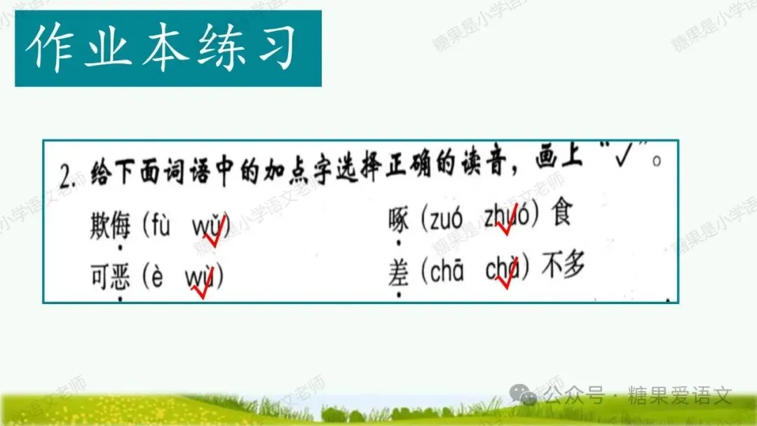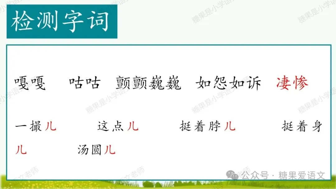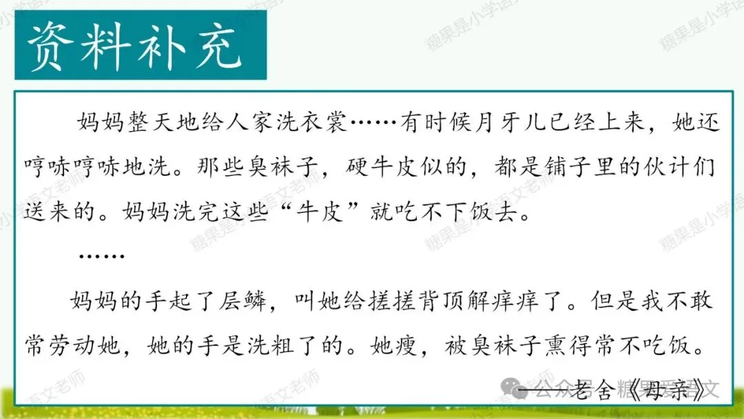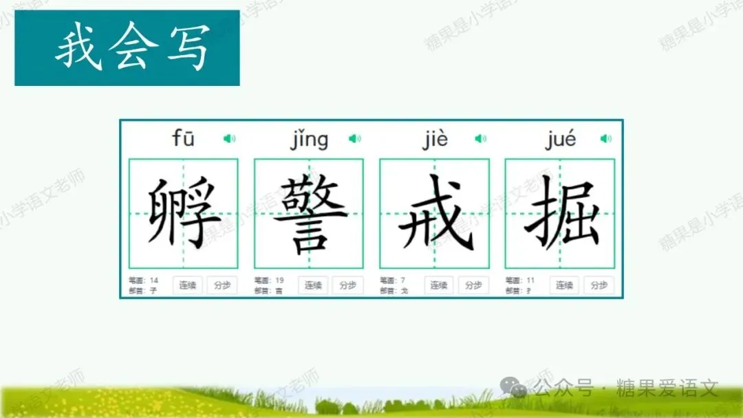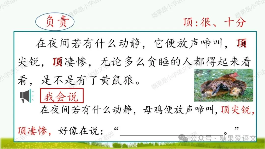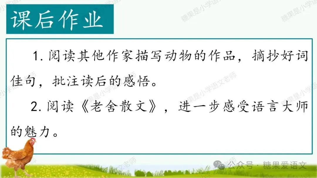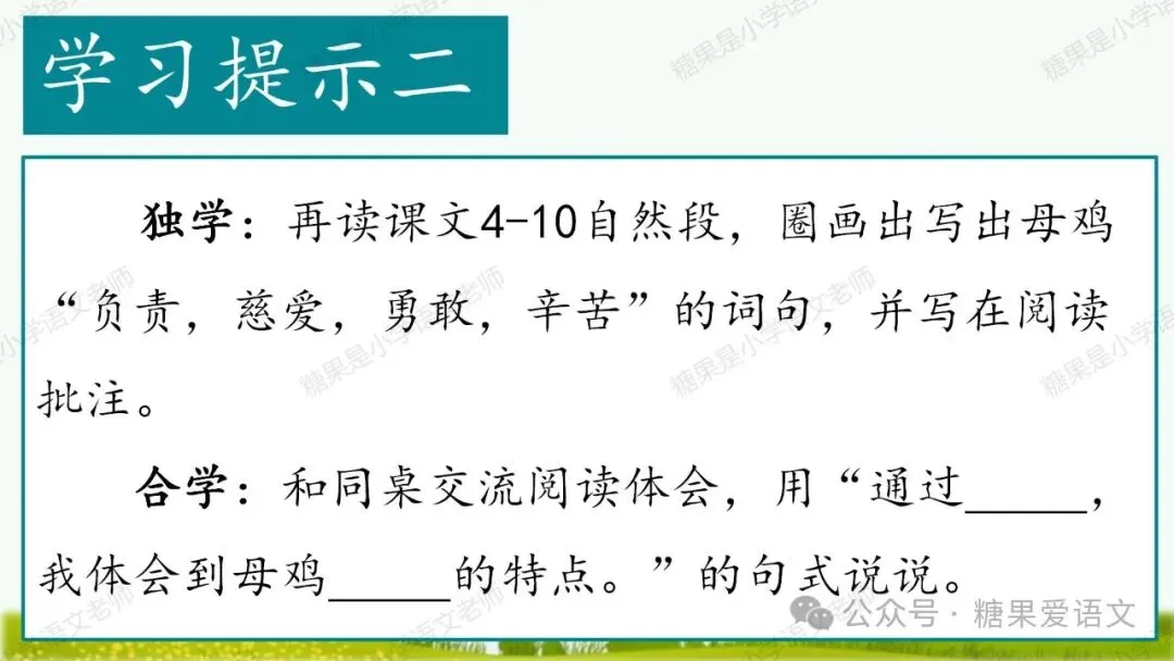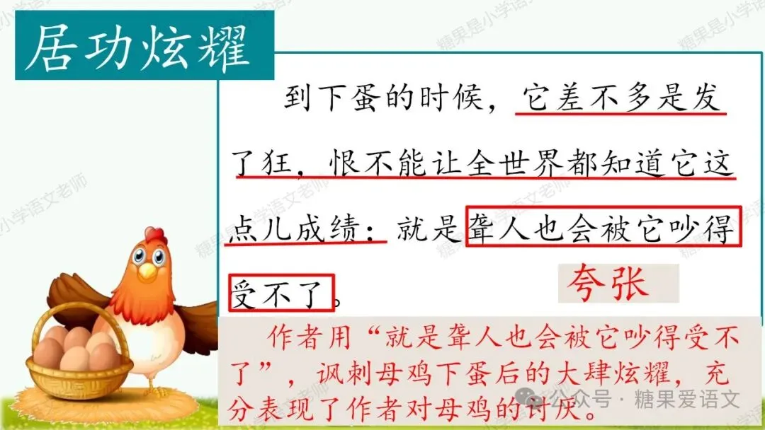 14.母鸡教学目标:1.认识“疙、瘩”等9个生字,读准多音字“恶”,会写“讨、厌”等15个字,会写“理由、心事”等10个词语。 2.默读课文,了解“我”对母鸡态度前后的变化,并说出变化的原因。 3.感受母鸡的“负责、慈爱、勇敢、辛苦”,体会母爱的伟大。 4.通过比较,感受同一作家在写不同动物时,表达上的相同和不同之处。 教学重难点: 体会作者对母鸡态度的变化,感受母鸡的特点。 教学安排:2课时 教学准备:ppt 教学流程: 第1课时教学目标:1.认识“疙、瘩”等9个生字,读准多音字“恶”,会写“讨、厌”等15个字,会写“理由、心事”等10个词语。 2.默读课文,了解“我”对母鸡态度前后的变化。 3.重点学习1-3自然段,了解母鸡令人讨厌的原因。 教学过程: 一、走进文本,初识母鸡1.孩子们,这个单元我们走进了“我的动物朋友”,认识了古怪的大猫和淘气的小猫。这节课呀,我们要一起走进老舍先生另一篇描写动物的散文《母鸡》,请同学们来读课题。 课件出示:课题 2.通过预习,你们知道老舍先生对母鸡态度是怎么样的? 预设:刚开始是很讨厌的,后面不敢讨厌了。 是啊,文中有这样两句话直接表达了他的的情感,我们一起来读。 课件出示: 我一向讨厌母鸡。 我不敢再讨厌母鸡了。 是的,起先是一向讨厌,后来不敢再讨厌了,怎么回事呢?出示:问号 赶紧打开书读读课文,找找老舍先生对母鸡的态度180度大转变的原因。 二、初读课文,字词过关1. 请同学们自由朗读课文,边读边圈画生字新词,把课文读得正确、流利、有感情。边读边思考:课文围绕“母鸡”主要写了什么? 课件出示: 1.自由朗读课文,边读边圈画生字新词,把课文读得正确、流利、有感情。 2.边读边思考:课文围绕“母鸡”主要写了什么? 2. 我们来读读这些生字。 课件出示:检测字词 请你读一读第一组词语,说说你发现了什么? 预设:第一组都是形容母鸡啼叫的词语。 预设:“嘎嘎、咕咕”都是拟声词; 预设:“颤颤巍巍、如怨如诉”都是形容母鸡叫声的状态。 补充:文中像“如怨如诉”这种ABAC形式的词语:没完没了、细声细气,也是形容母鸡的叫声的。 请同学们读一读,感受母鸡的啼叫声。 第二组词语呢? 预设:第二组词语都是儿化音。 是啊,老舍先生是北京人,他的很多文章里都带有儿化音,我们试着读好它。 这里还有一个多音字,谁能来读读。 课件出示:多音字 现在请同学们完成作业本练习。 课件出示:作业本第2题 3.现在让我们回到课文,从开始的“一向讨厌”到后来的“不敢再讨厌”,老舍先生对母鸡的态度是从哪里开始变化的呢? 预设:第4自然段(课件横线画出) 追问:你发现了什么? 预设:是过渡段,在文中起到承上启下的作用。 找到了过渡段,还有首尾的关键句,课文的结构便清晰地展现在我们眼前,你还发现了什么? 预设:前面的三个自然段写作者讨厌母鸡,从第4自然段开始到末尾,写作者不敢再讨厌母鸡。课件出示:框出1-3自然段,动画框出4-10自然段 看看画横线的三句话,谁能说说课文围绕“母鸡”写了什么? 预设:作者本来很讨厌母鸡,但他看见一只孵出一群鸡群的母鸡,他对他一开始很讨厌的母鸡,但是看到这只母鸡后他改变了他的心思,变得不再讨厌母鸡了。 小结:是啊,抓住了关键句,我就能这么长的文章读成几句话,我们在概括主要内容的时候就可以用上这样的方法。 三、研读段落,感悟“讨厌”1. 老舍为什么讨厌母鸡?我们先来研读课文的第1-3自然段。请大家默读第1-3自然段,找找作者讨厌母鸡的原因,完成作业本第3题上半部示意图。注意:默读要做到不出声,不指读,圈点勾画。 课件出示: 默读第1-3自然段,找找作者讨厌母鸡的原因,完成作业本第3题上半部示意图。 2. 交流展示,体会“讨厌” 好的,孩子们。我们一起来交流,作者讨厌母鸡的是第一件事是什么?请同学们跟我看到第一自然段。 预设:母鸡的叫声很不好听,也是无病呻吟。 点拨:好的,第一件事情,孩子们找到了一只叫声难听的母鸡。接着来,作者讨厌母鸡的第二件事是? 预设:它永远不反抗公鸡,而且这只母鸡它非常的欺软怕硬。 预设:第三件事是说这只母鸡是一只人群中炫耀显摆的母鸡。 师:孩子们,你们看三个段落的三件事情。你们的作业本都填对了吗?意思相近即可。 课件出示:作业本第3题上半部分答案 3.咱们一件一件来看,先听听这叫声有多难听。请同学们自由朗读课文第1自然段,请同学们来交流学习体会。 (1)母鸡的叫声是怎样的? 预设:嘎嘎。动画圈出嘎嘎 咱们来听听这嘎嘎声是什么样子的。(播放音频)什么感觉? 预设:很烦人感觉。 预设:感觉很烦躁。 点拨:这烦躁的叫声,在你吃饭的时候的叫,在你写作业的时候它在叫,在你睡觉的时候它还在叫,一个词叫? 预设:没完没了。课件圈出没完没了 这没完没了的嘎嘎声,真是讨厌。你能借助下面的句式说说吗? 设:这一只叫声难听的母鸡,令人心烦。 出示文字: 这是一只()的母鸡,令人()。 (2)是啊,这没完没了的嘎嘎声真是讨厌。有的时候,它还发出另外一种讨厌的叫法,说说看。 预设:有的时候,它不这样乱叫,而是细声细气的,有什么心事似的,颤颤巍巍的,顺着墙根,或沿着田坝,那么扯长了声如怨如诉,使人心中立刻结起个小疙瘩来。这句话的这个声音让我感到很烦躁。(课件出示) 追问:句中的“颤颤巍巍”、“如怨如诉”都形容母鸡的声音,他们有什么区别? 预设:颤颤巍巍是形
