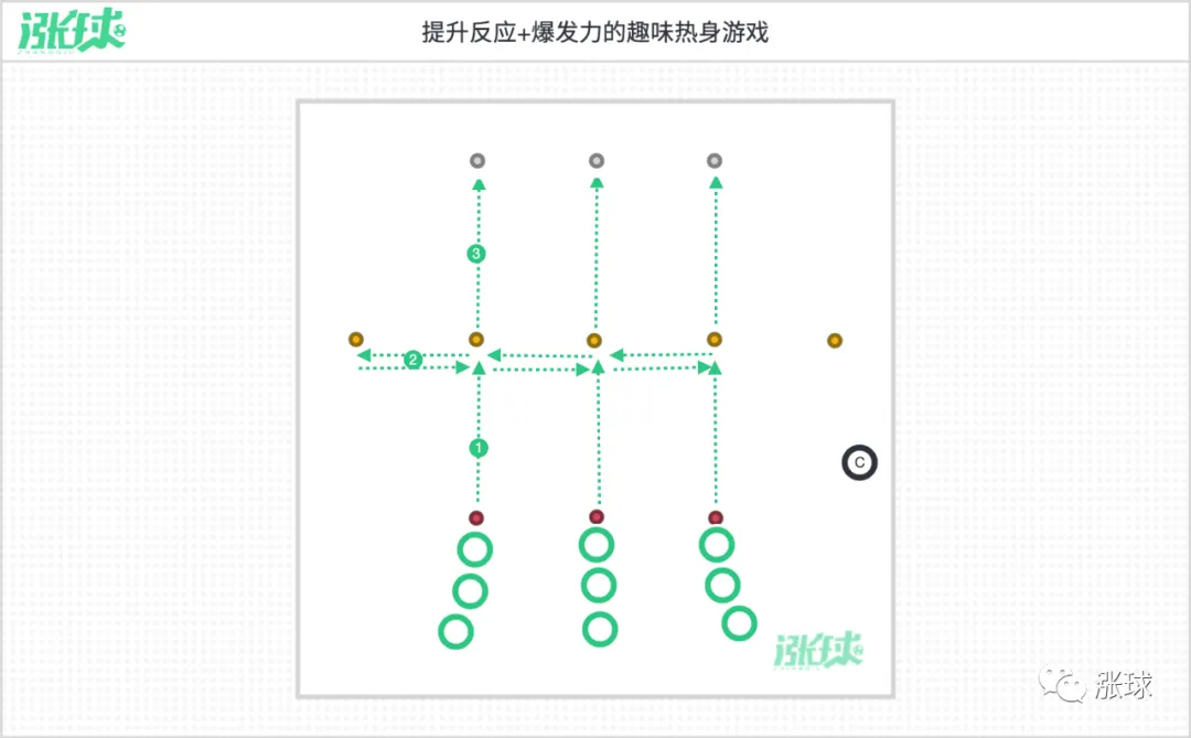 该热身训练来自英超豪门利物浦队,通过趣味游戏的方式培养球员的爆发力和瞬时反应能力,也能通过竞赛的模式提升球员的专注度和热身投入度。