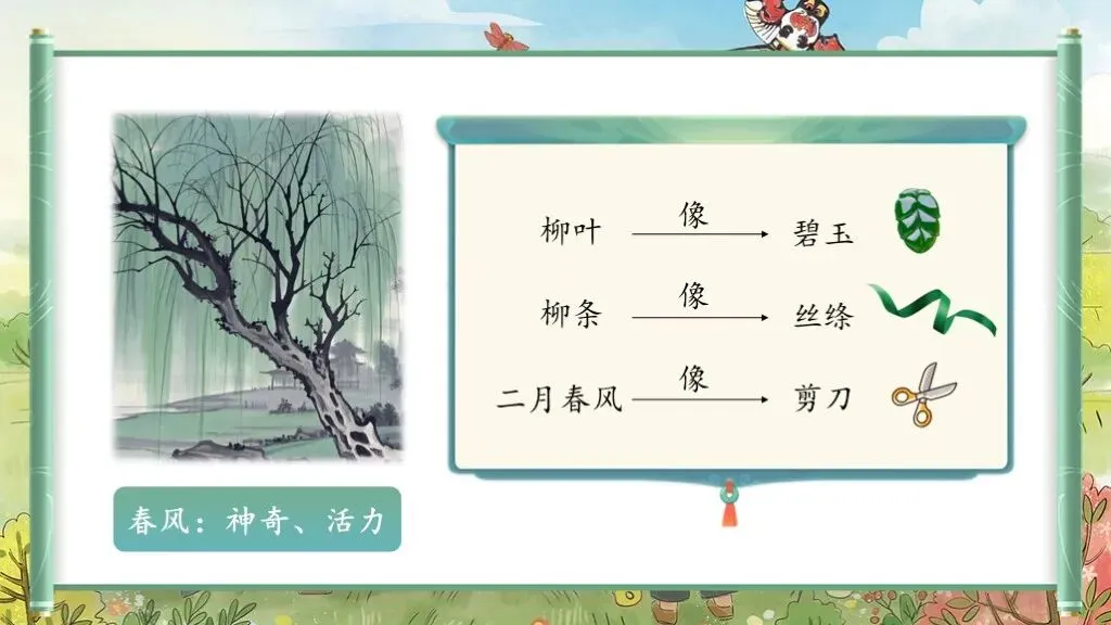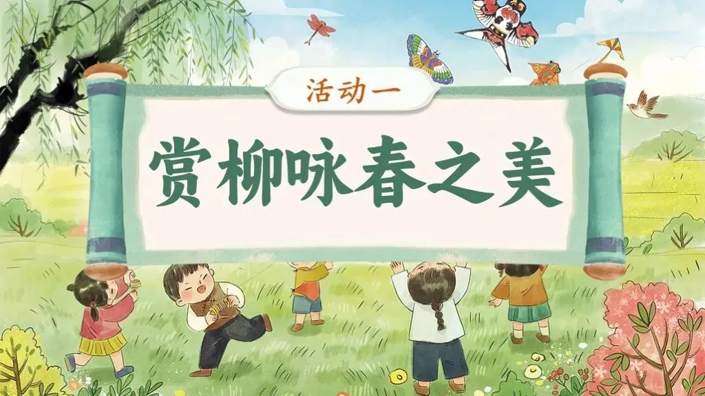 课件播放春天的鸟鸣声、流水声等自然音效,同时在屏幕上展示春天的风景图片,如绿草如茵、鲜花盛开、柳树摇曳等。引导学生闭上眼睛,静静地聆听和感受。