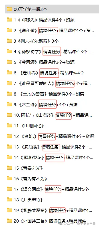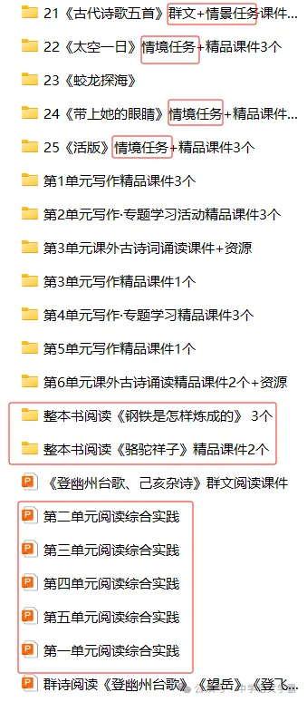 2026春部编版七年级新语文下册(新教材)课件,内容包含全册六个单元所有课文课件,以及写作,整本书阅读课件。其中还有16课情境任务设计,新增五个单元阅读综合实践课件。每篇课文基本2到3个课件甚至更多,风格不同都是从众多课件中精选出来的,目的是方便老师们备课参考。如购您买一册课件另外赠送“教师班主任常用资源包”内容涵盖如“主题班会课件,各种计划总结、表格,黑板报,学生评语,励志教育等,另外还赠送课前5分钟励志教育小视频,语文课高效神器等目录如下: