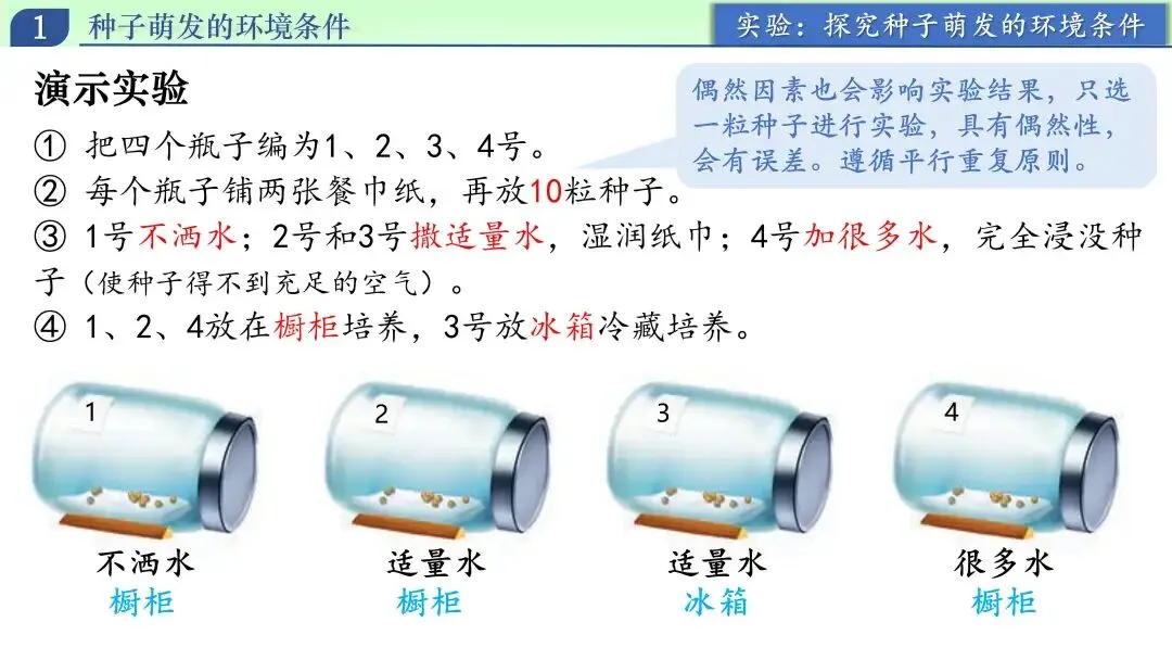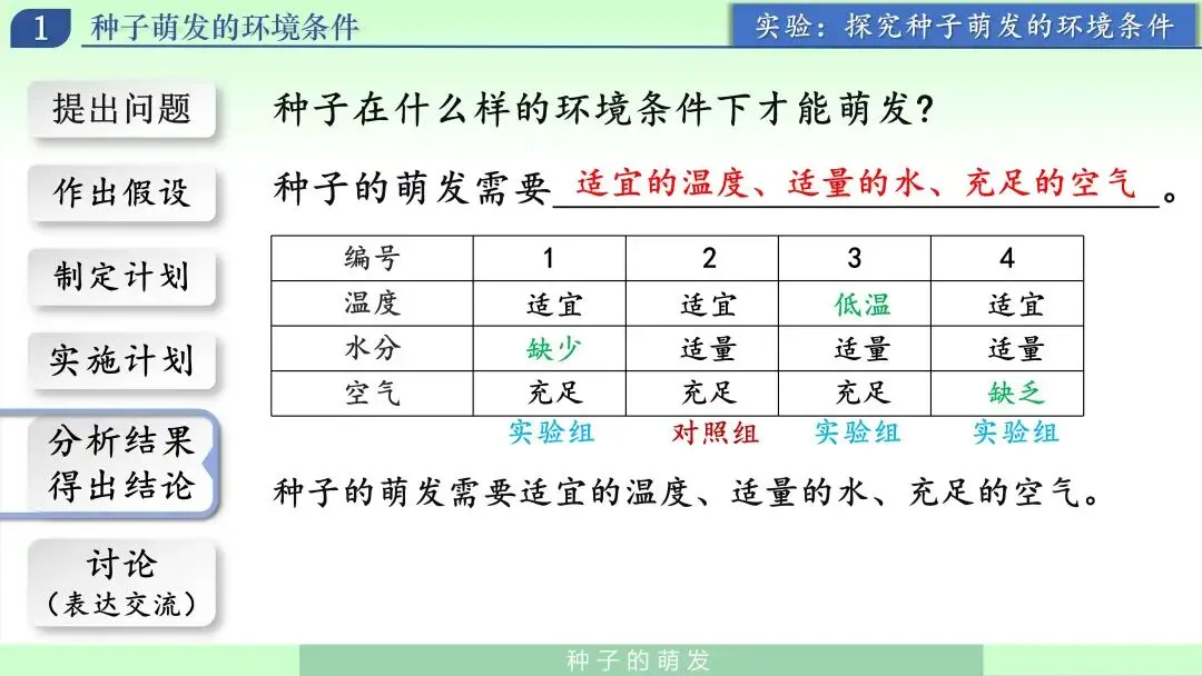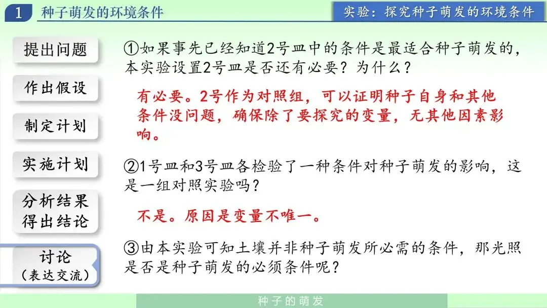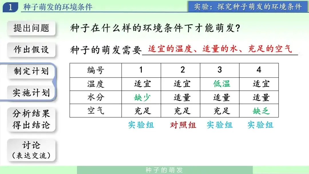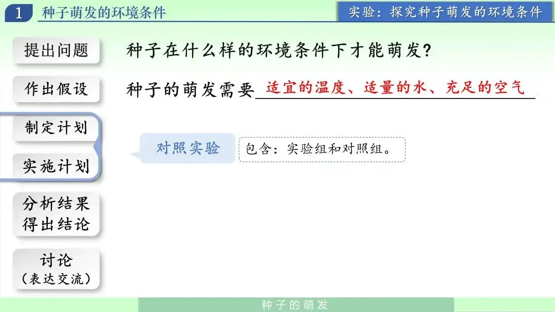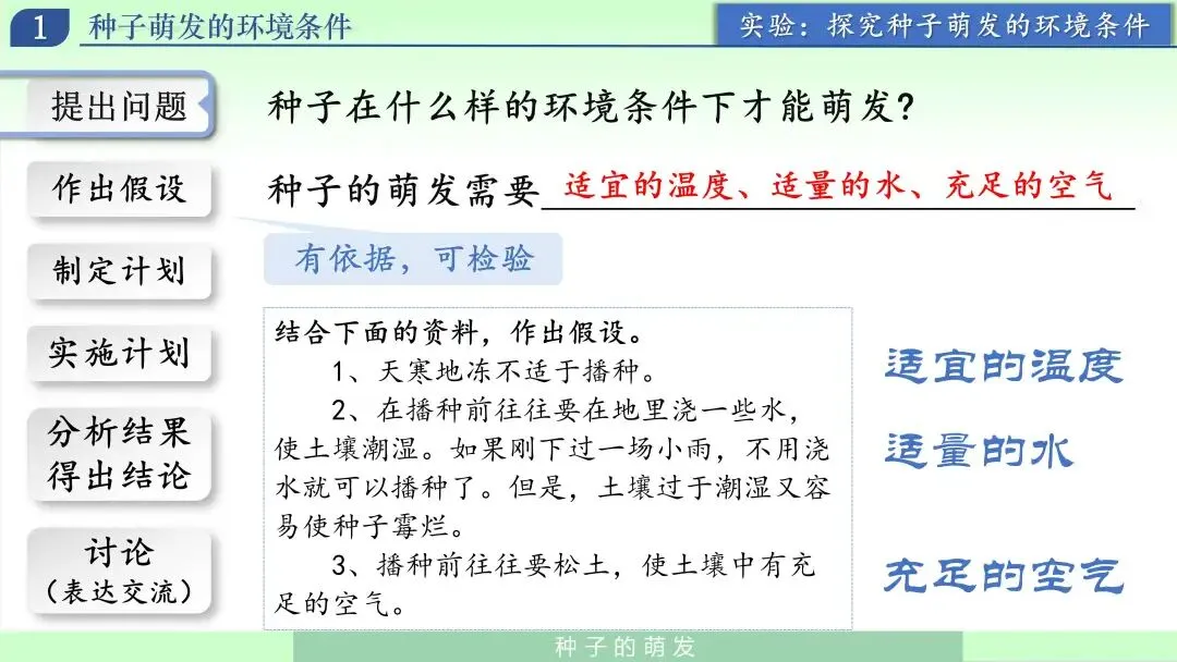 我引导学生把刚才的经验转换成可检验的假设:种子萌发可能需要水分、需要合适的温度、还需要空气。此时强调:假设不是结论,结论要靠实验验证。