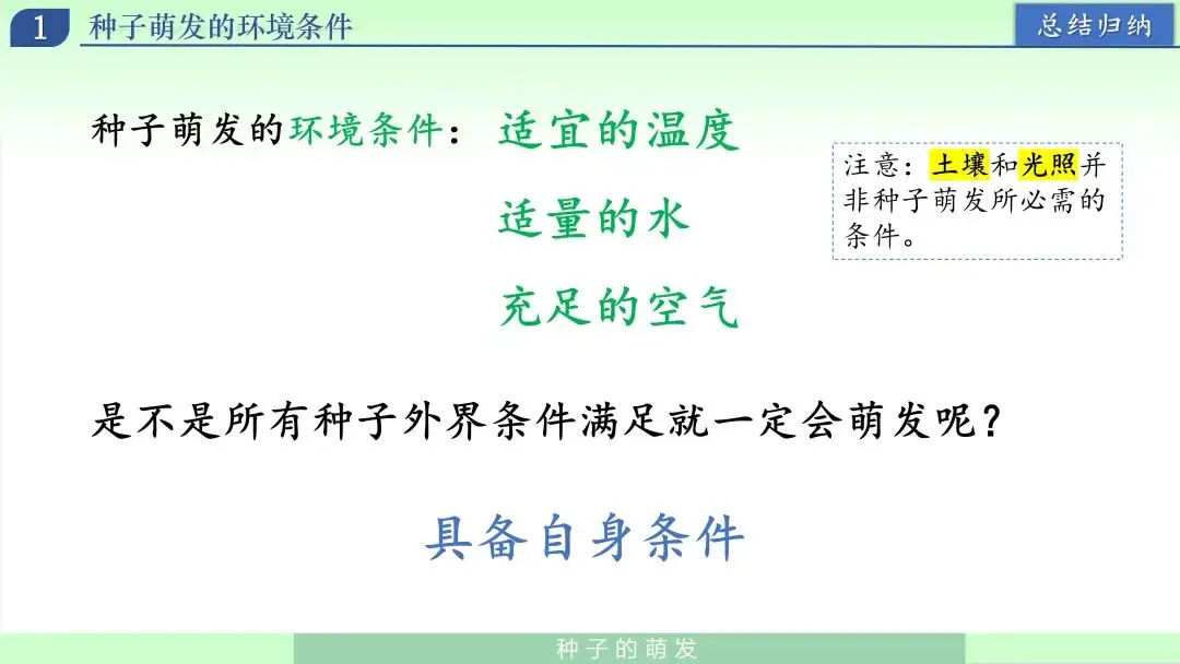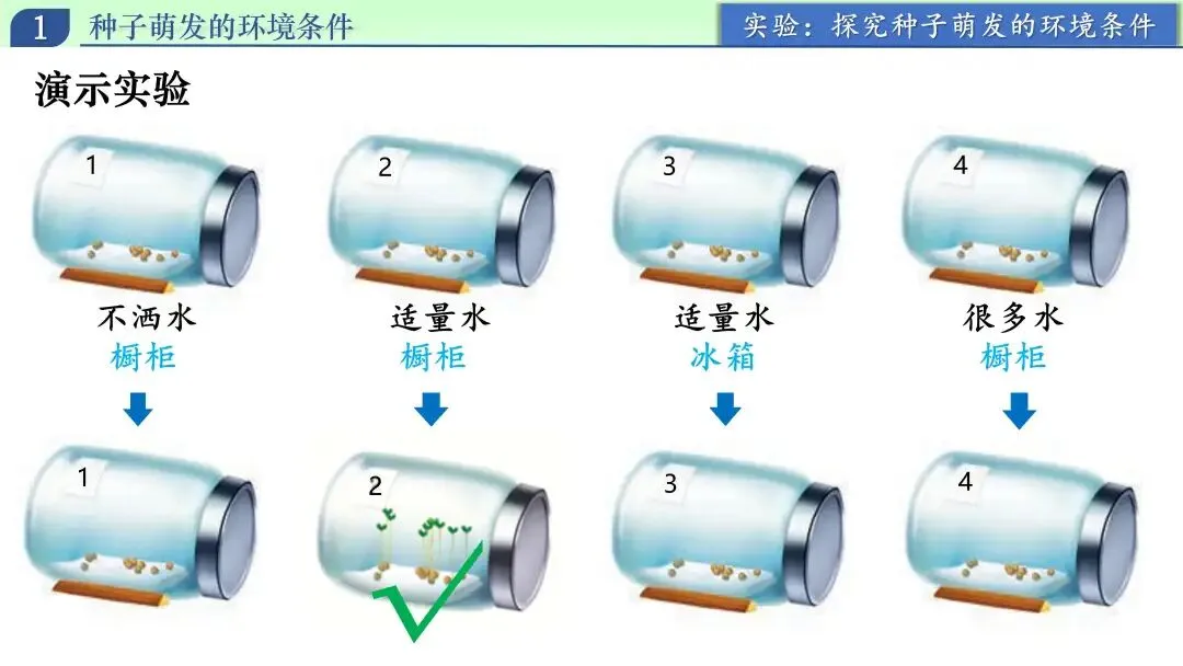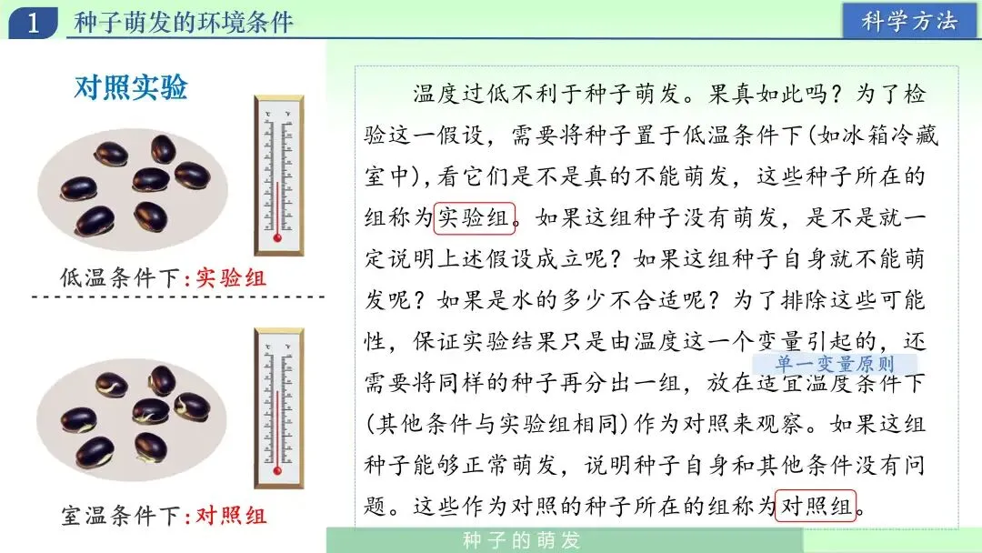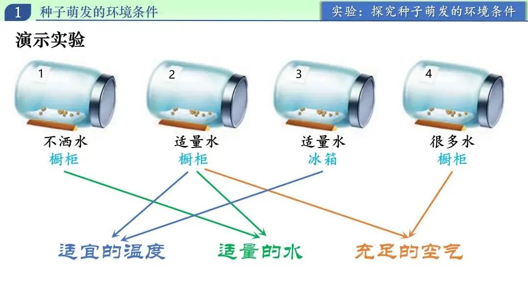 在得出三项必需条件后,我继续追问:“种子萌发一定需要土壤吗?一定需要光吗?”学生通常会说“要土壤、要阳光”。我引导他们回到生活证据:发豆芽在盘子里也能萌发,说明土壤不是必需条件。随后进一步说明:光照对不同种子作用并不相同,有的种子需要光,有的在黑暗中也能萌发,所以不能简单说“光是所有种子萌发的必需条件”。这里我强调概念边界:本节讨论的是“普遍必需条件”,结论是水、温度、空气;土壤和光照不属于普遍必需条件。通过这一环节,帮助学生避免“经验绝对化”,学会区分“常见条件”和“必需条件”。