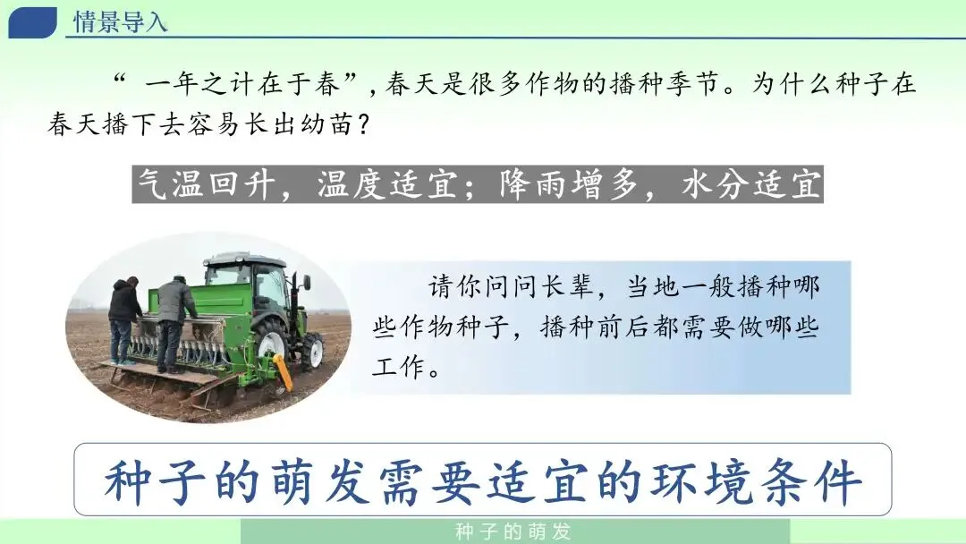 课堂伊始,我用一句“一年之计在于春”引入,让学生回忆春天播种更易出苗的经验,追问:“为什么春天播下去更容易长出幼苗?如果在冬天、或者不浇水,会怎样?”在学生表达“温度高了、雨水多了”的基础上,我顺势提出本节核心问题:种子在什么条件下才能萌发?并说明:今天我们不只靠感觉判断,而要用实验找证据。