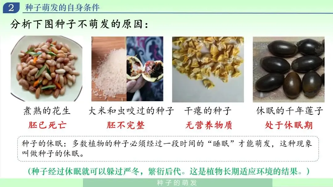 我展示几种典型情境:煮熟的花生、虫咬破损的种子、干瘪不饱满的种子、长期休眠后仍能萌发的特殊种子等,引导学生思考“不萌发”可能不是环境单一因素造成的。随后组织学生归纳三条自身条件,并板书成条: