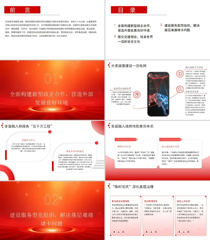 今天要分享的课件是:《党课电力系统党建引领聚合力赋能治理开新局PPT课件》,讲稿字数:4683字,党课ppt页数:16页。在能源基础设施领域,组织建设对提升运营效能具有关键作用。电力系统作为关系国计民生的关键网络,面临能源转型、技术升级、服务优化等多重任务,需要强有力的组织动员能力来凝聚共识、协调行动。通过强化内部组织建设,能够有效整合跨部门、跨层级资源,将战略目标转化为一线执行力,在保障能源安全、推动绿色转型等重大任务中形成攻坚合力,为治理现代化提供组织保障。