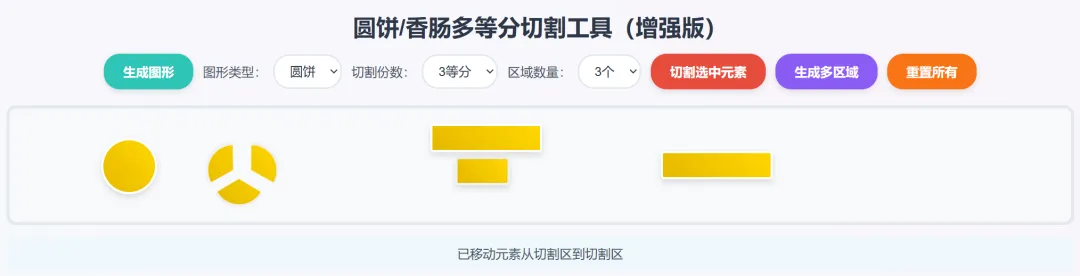 这个圆饼/香肠多等分切割工具(增强版)是一个专门为数学教育设计的互动式学习工具,主要作用体现在以下几个方面: