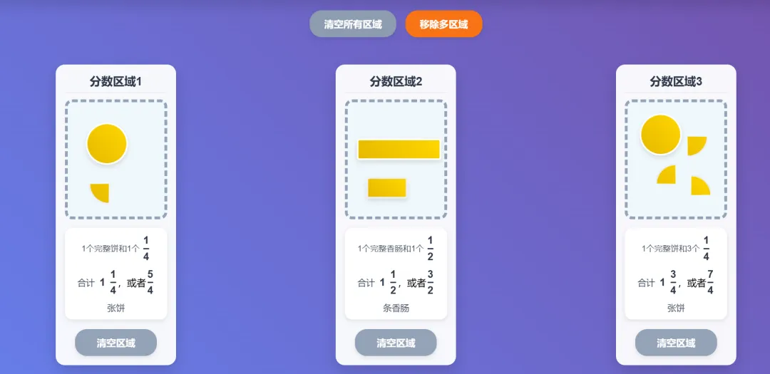 分数加法:将不同分数的片段拖拽到同一区域,自动计算总和