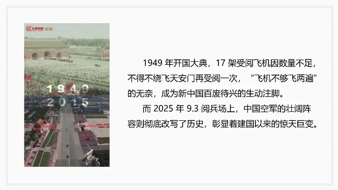1949 年开国大典,17 架受阅飞机因数量不足,不得不绕飞天安门再受阅一次,“飞机不够飞两遍” 的无奈,成为新中国百废待兴的生动注脚。而 2025 年 9.3 阅兵场上,中国空军的壮阔阵容则彻底改写了历史,彰显着建国以来的惊天巨变。