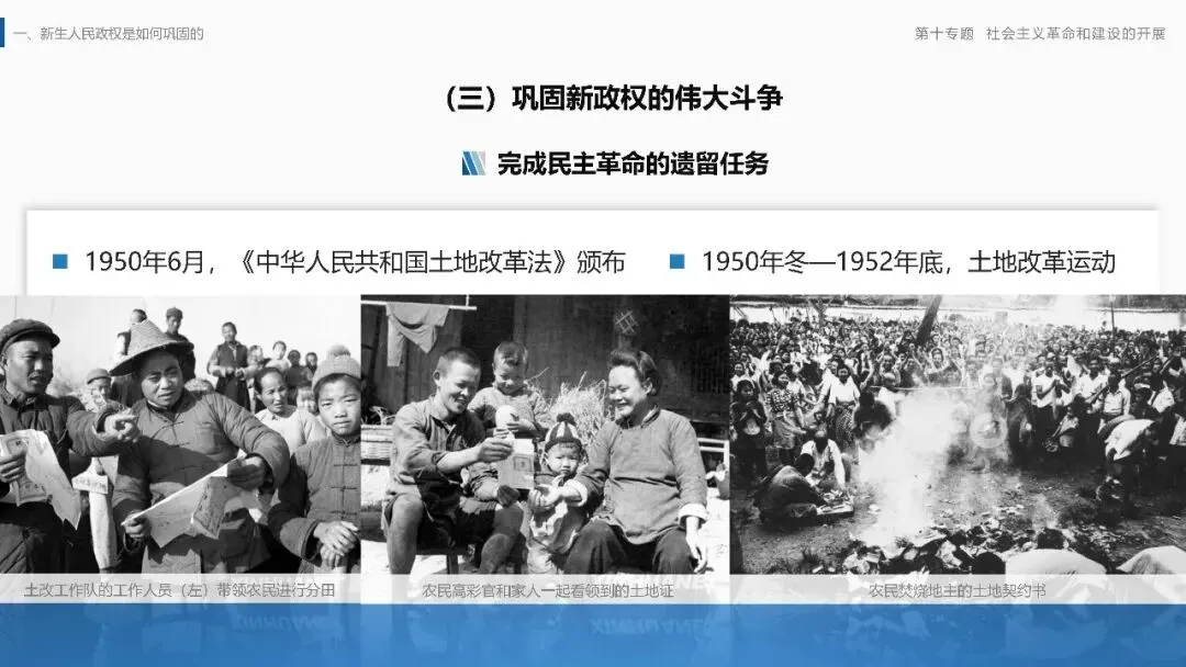 完成民主革命的遗留任务。1950年6月,中央人民政府委员会通过了《中华人民共和国土地改革法》。这部法律总结了中国共产党过去领导土地改革的历史经验,适应新中国成立后的新形势,成为指导新解放区土地改革的基本法律依据。