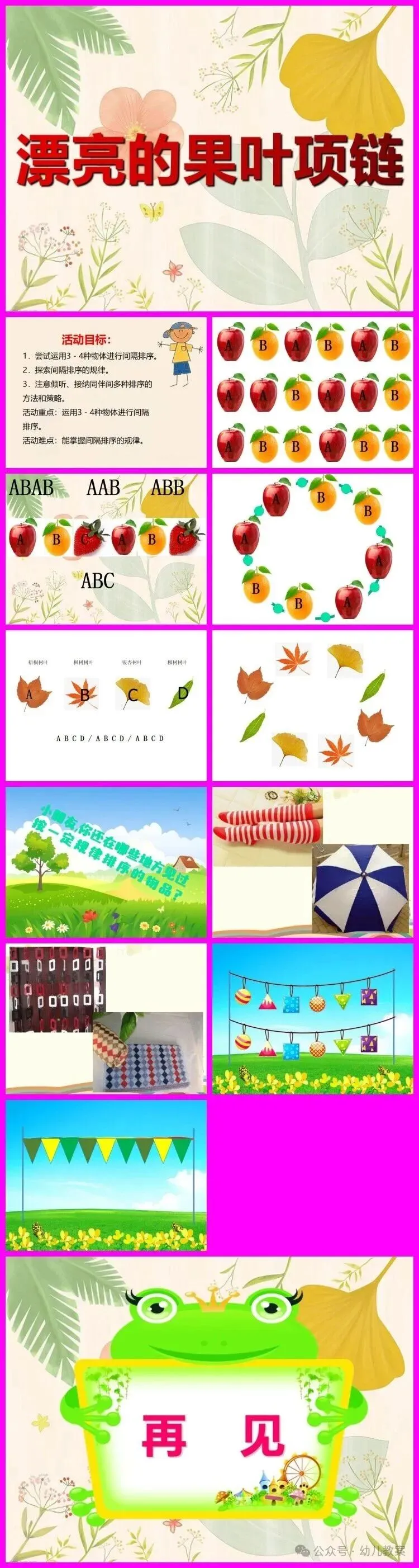 3.师幼讨论:你能用这3种图案设计出一条漂亮的项链吗?你想怎么有序地排列3种树叶呢?