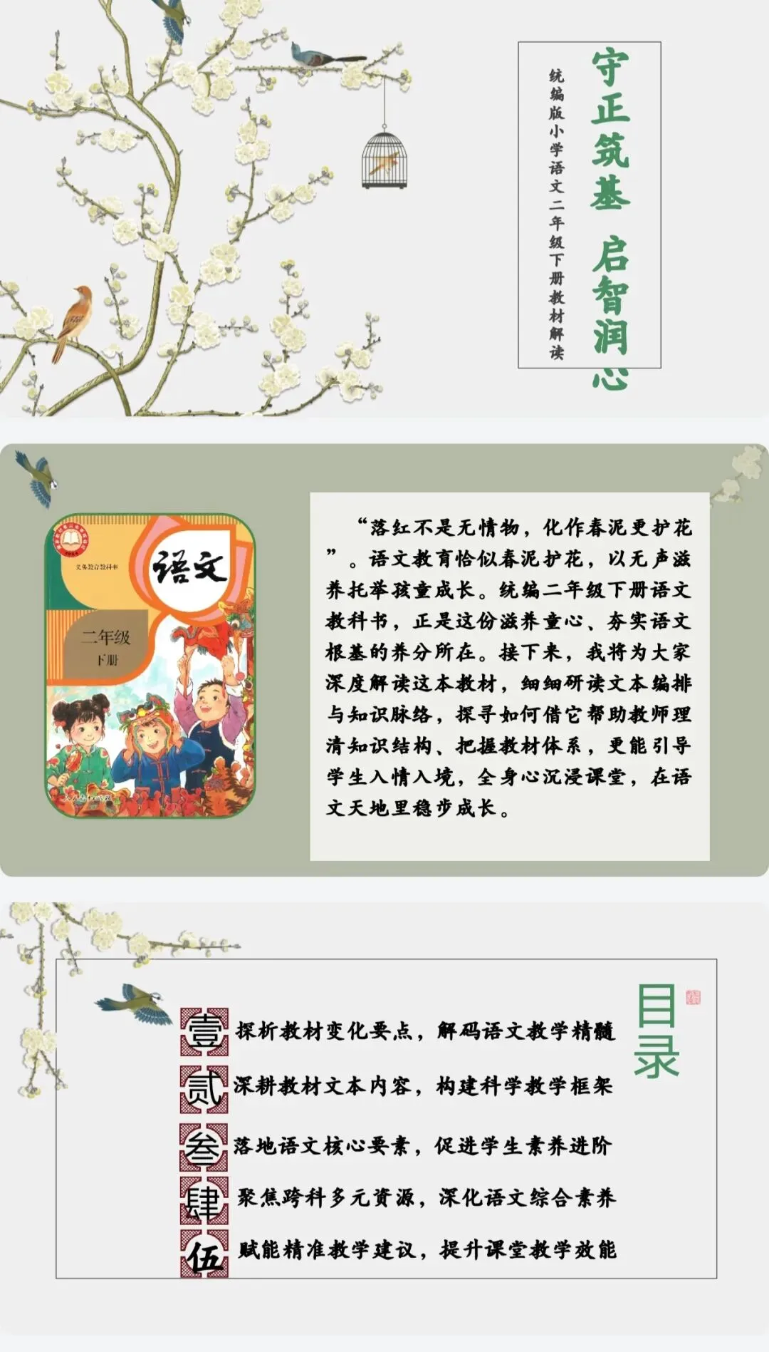 “落红不是无情物,化作春泥更护花”。语文教育恰似春泥护花,以无声滋养托举孩童成长。统编二年级下册语文教科书,正是这份滋养童心、夯实语文根基的养分所在。接下来,我将为大家深度解读这本教材,细细研读文本编排与知识脉络,探寻如何借它帮助教师理清知识结构、把握教材体系,更能引导学生入情入境,全身心沉浸课堂,在语文天地里稳步成长。