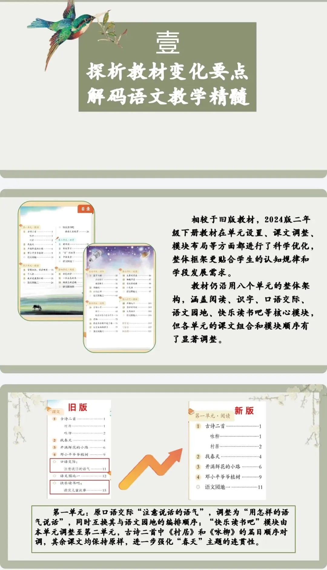 第一单元:原口语交际“注意说话的语气”,调整为“用怎样的语气说话”,同时互换其与语文园地的编排顺序;“快乐读书吧”模块由本单元调整至第二单元,古诗二首中《村居》和《咏柳》的篇目顺序对调,其余课文均保持原样,进一步强化“春天”主题的连贯性。