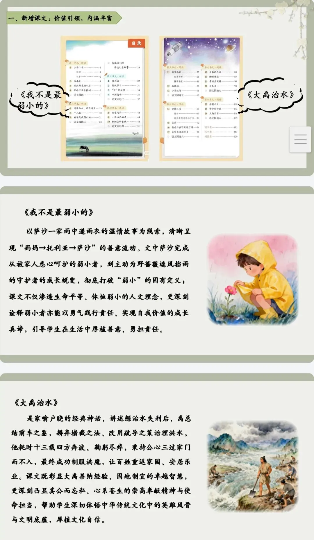 新版教材新增了两篇极具教育意义的课文,分别是第二单元的《我不是最弱小的》和第八单元的《大禹治水》。