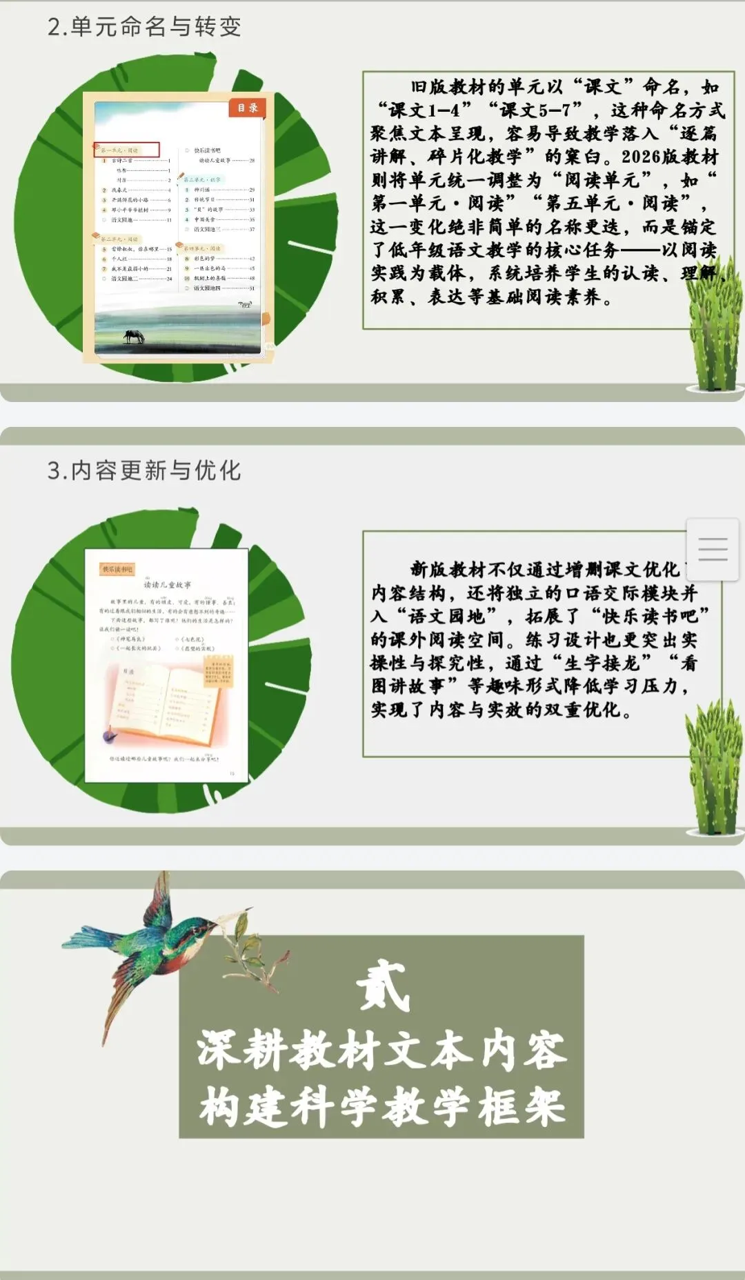 2.单元命名与转变:旧版教材的单元以“课文”命名,如“课文1-4”“课文5-7”,这种命名方式聚焦文本呈现,容易导致教学落入“逐篇讲解、碎片化教学”的窠臼;2026版教材则将单元统一调整为“阅读单元”,如“第一单元·阅读”“第五单元·阅读”,这一变化绝非简单的名称更迭,而是锚定了低年级语文教学的核心任务——以阅读实践为载体,系统培养学生的认读、理解、积累、表达等基础阅读素养。