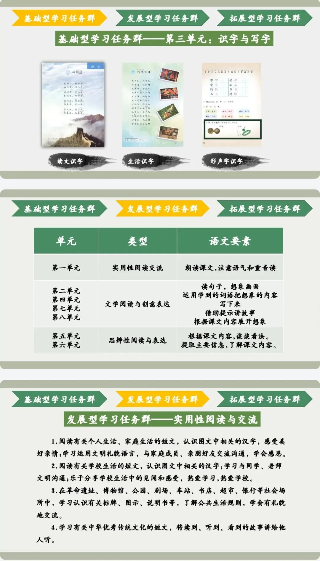 本册教材共编排了8个单元,包括一个识字单元和7个阅读单元。根据内容的组织和语文要素,我将这8个单元尝试划分为学习任务群。第一层是以语言文字积累与梳理为基础的学习任务群。