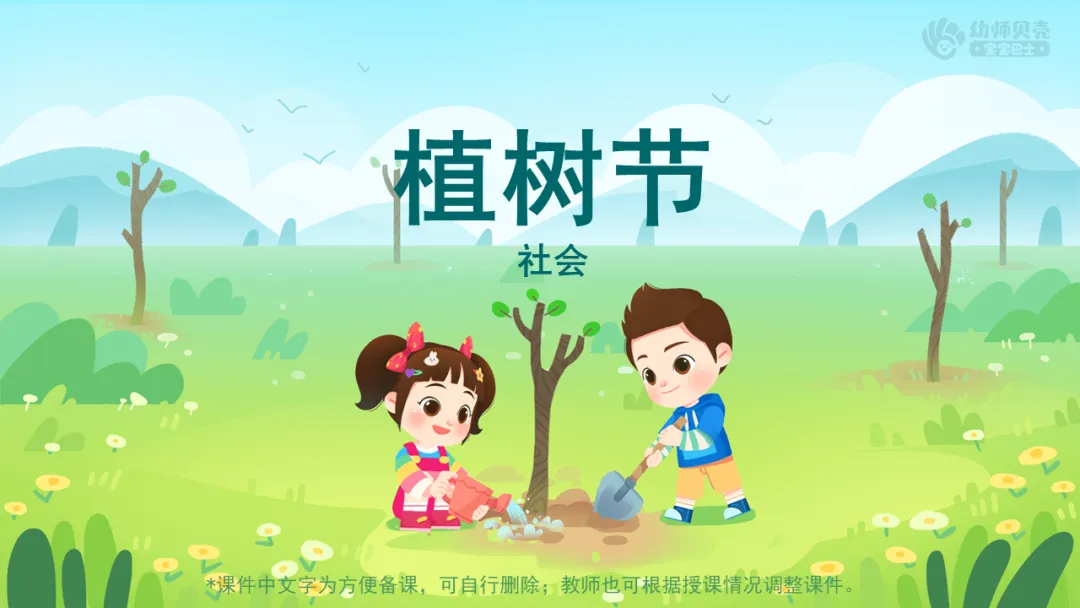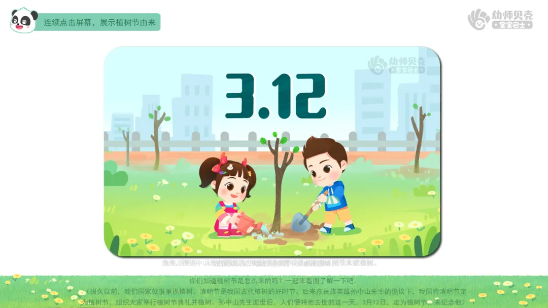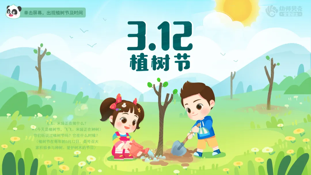 ——今天是植树节,飞飞、米娅正在种树。你们听说过植树节吗?它在什么时候呢?