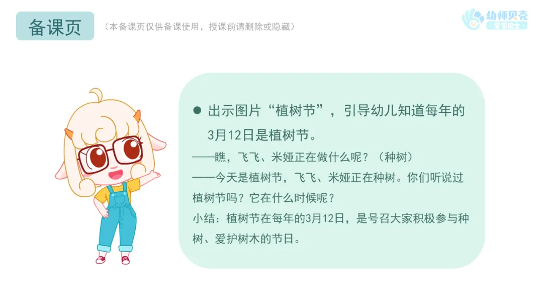 ——今天就是植树节啦,让我们用实际行动爱护幼儿园里的树木吧!我们可以给幼儿园的树木浇水,帮助它们成长。请小朋友们排好队,我们准备出发咯!