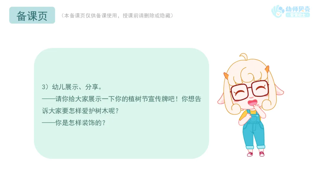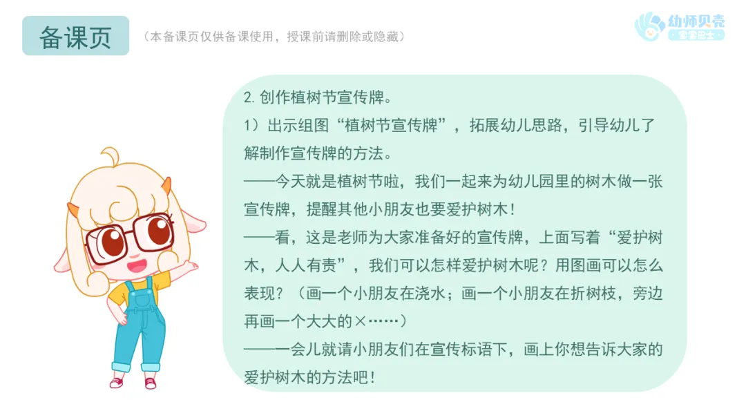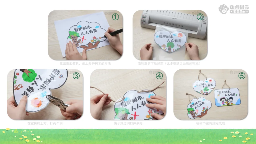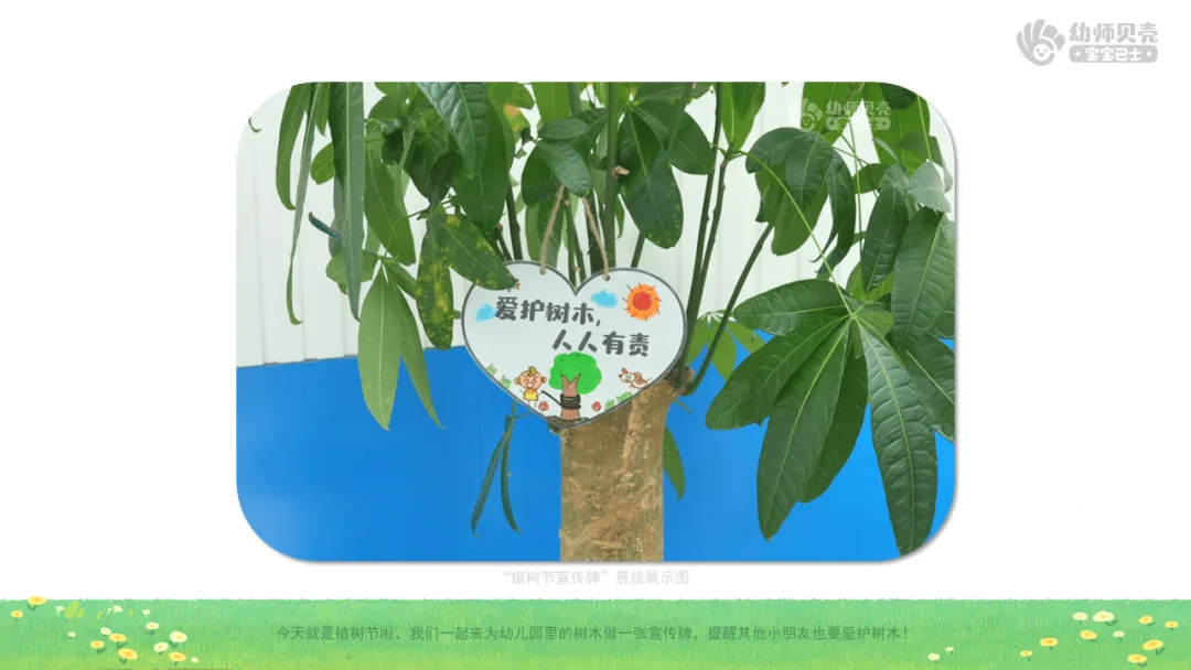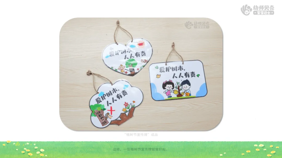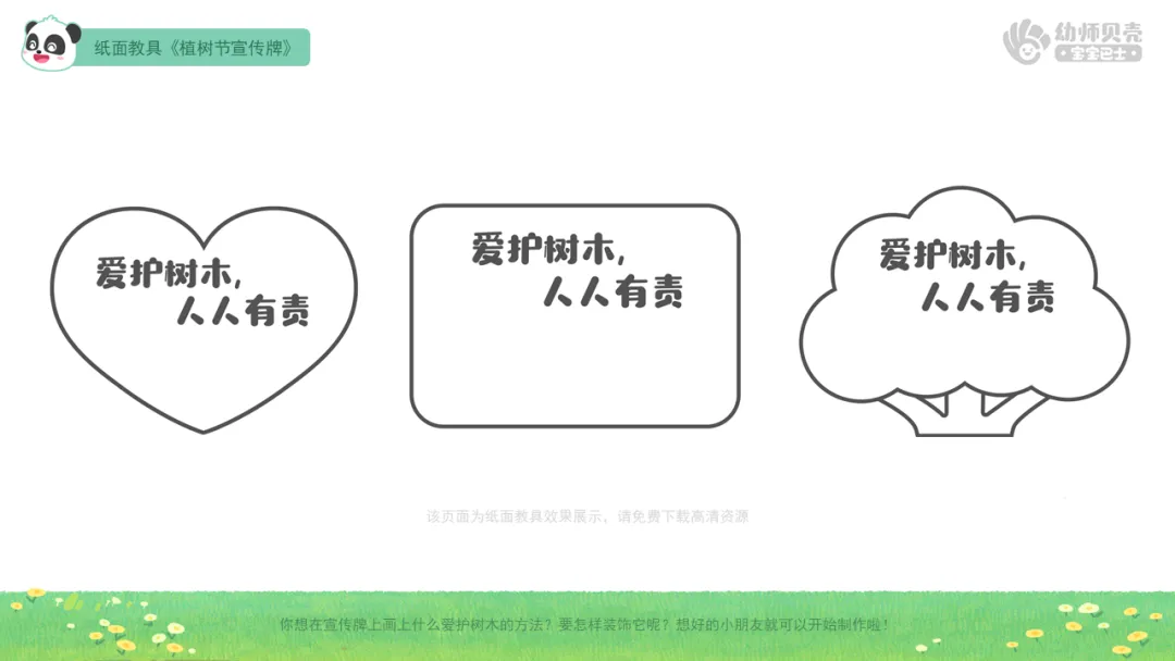 ——今天就是植树节啦,我们一起来为幼儿园里的树木做一张宣传牌,提醒其他小朋友也要爱护树木!