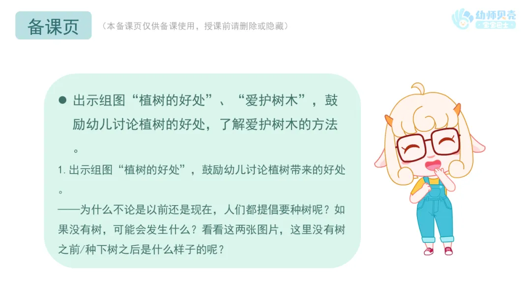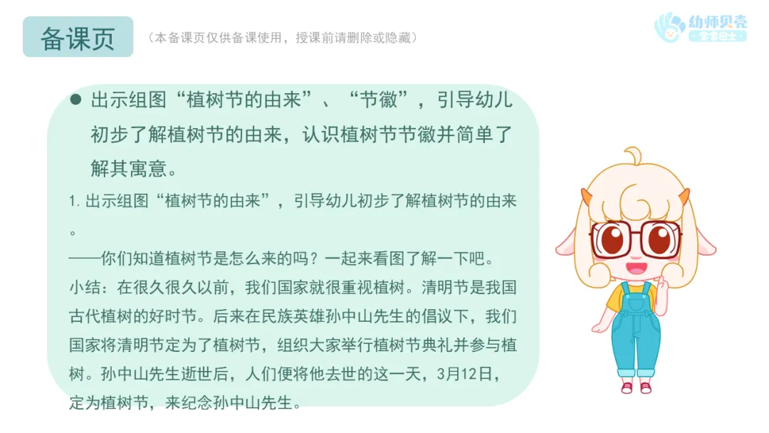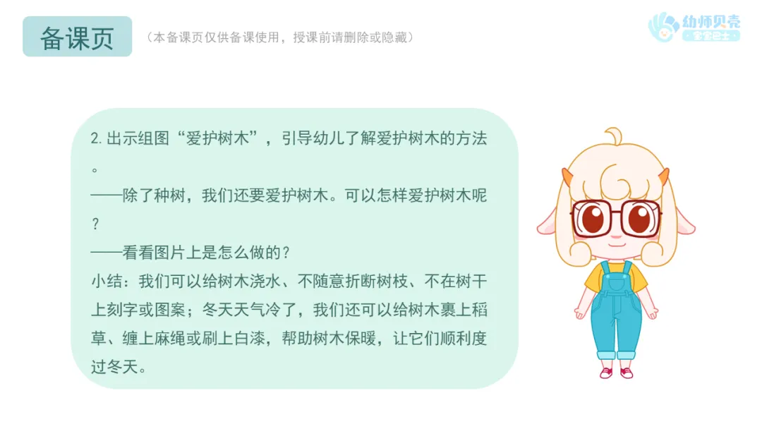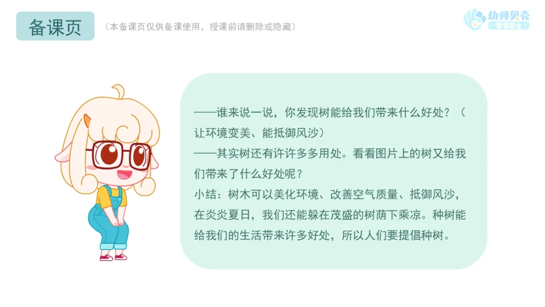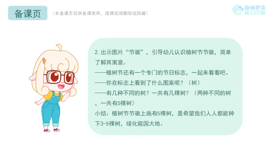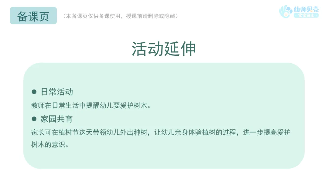 ——今天就是植树节啦,我们一起来为幼儿园里的树木做一张宣传牌,提醒其他小朋友也要爱护树木!