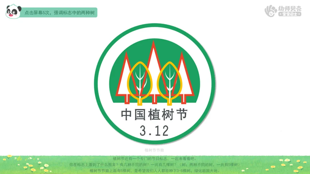 小结:植树节节徽上画有5棵树,是希望我们人人都能种下3-5棵树,绿化祖国大地。