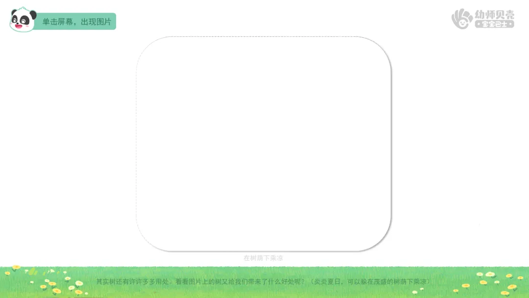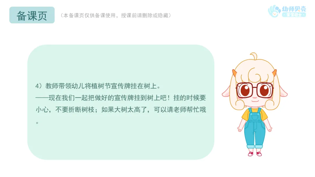 ——现在我们一起把做好的宣传牌挂到树上吧!挂的时候要小心,不要折断树枝;如果大树太高了,可以请老师帮忙哦。