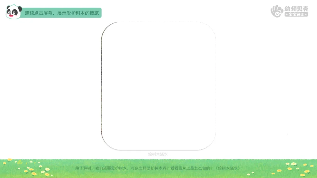 l发放相应材料,鼓励幼儿以浇水或制作宣传牌的方式表达对树木的爱护,提高保护树木的意识。