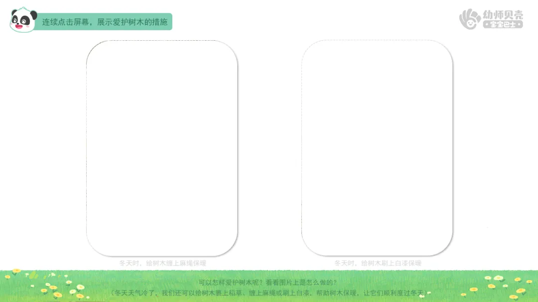 小结:我们可以给树木浇水、不随意折断树枝、不在树干上刻字或图案;冬天天气冷了,我们还可以给树木裹上稻草、缠上麻绳或刷上白漆,帮助树木保暖,让它们顺利度过冬天。