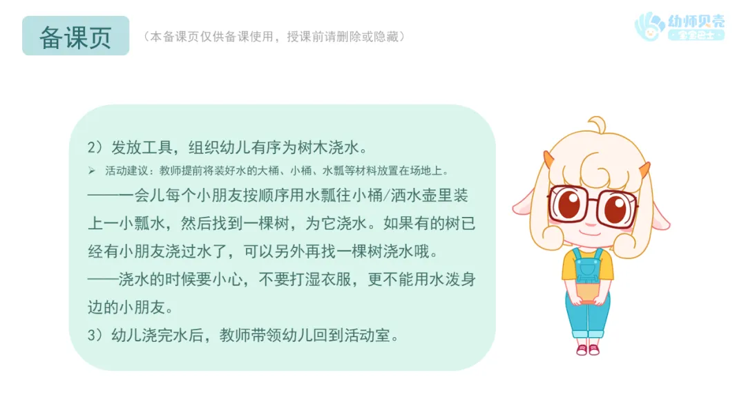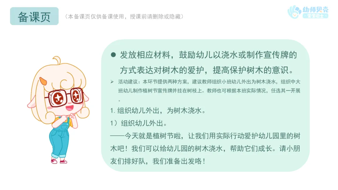 Ø活动建议:本环节提供两种方案,建议教师组织小班幼儿外出为树木浇水,组织中大班幼儿制作植树节宣传牌并挂在树枝