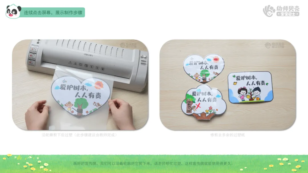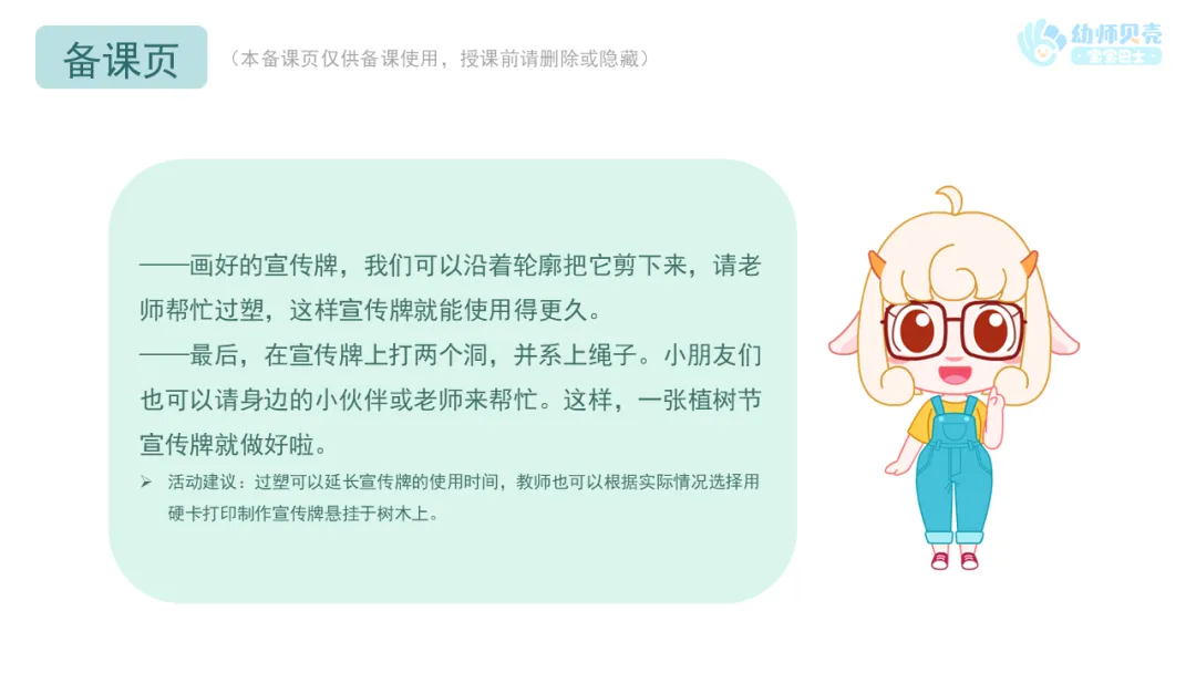 Ø活动建议:过塑可以延长宣传牌的使用时间,教师也可以根据实际情况选择用硬卡打印制作宣传牌悬挂于树木上。