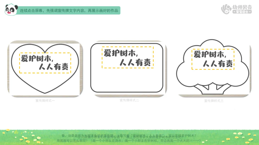 ——看,这是老师为大家准备好的宣传牌,上面写着“爱护树木,人人有责”,我们可以怎样爱护树木呢?用图画可以怎么表现?(画一个小朋友在浇水;画一个小朋友在折树枝,旁边再画一个大大的×……)