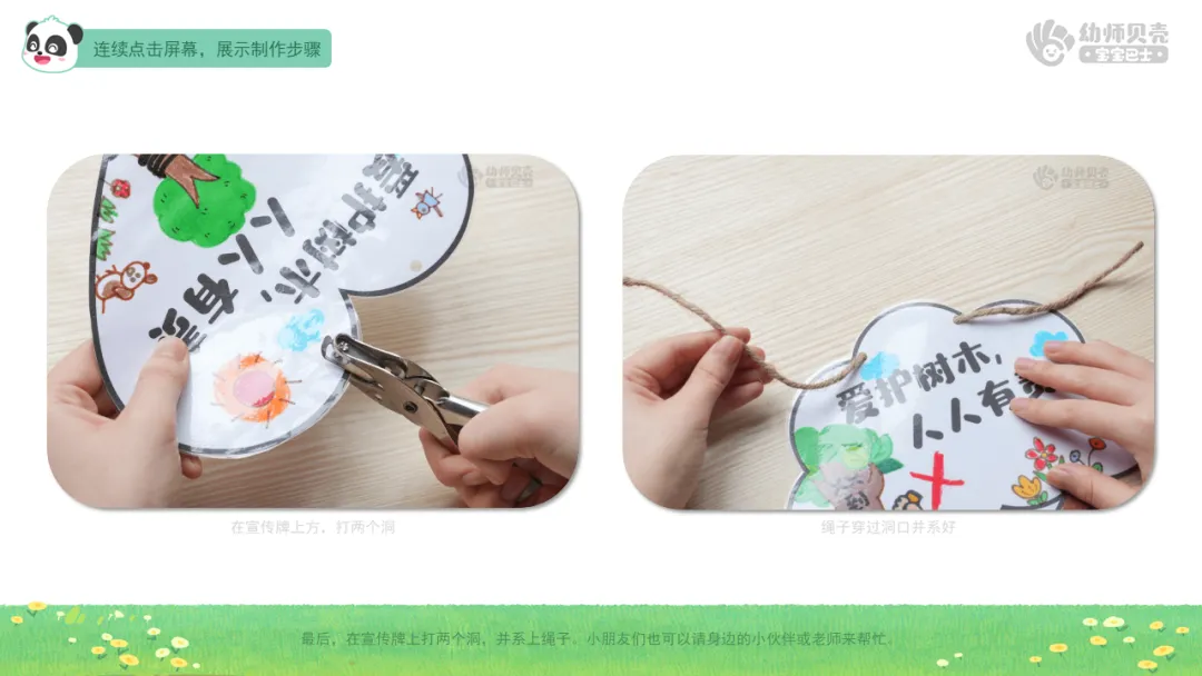 ——最后,在宣传牌上打两个洞,并系上绳子。小朋友们也可以请身边的小伙伴或老师来帮忙。这样,一张植树节宣传牌就做好啦。