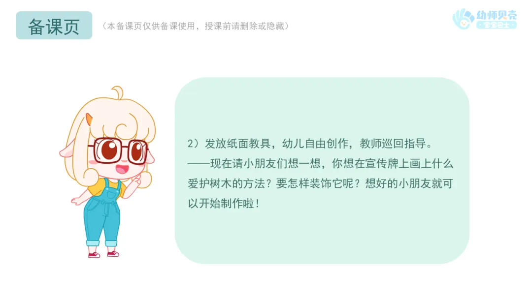 ——现在请小朋友们想一想,你想在宣传牌上画上什么爱护树木的方法?要怎样装饰它呢?想好的小朋友就可以开始制作啦!