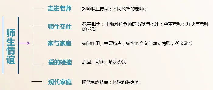 【考点精讲】 核心观点 1.老师是我们知识学习的指导者,也是我们精神成长的引路人。 2.师生交往的良好状态是学生乐于学习,老师寓教于乐,师生彼此尊重、相互关心、携手共进。 3.家是我们身心的寄居之所,是我们心灵的港湾。(重要性) 4.孝亲敬长是中华民族的传统美德,也是每个中国公民的法定义务。(原因) 5.尽孝在当下。孝敬双亲长辈,关爱家人,不仅仅是长大成人以后的事,从现 在开始,我们就应该用行动表达孝敬之心。(做法) 知识点1 师生交往 【材料关键词】批评、表扬、“最美老师”、“教书育人楷模”等 1.教师职业的特点P61~69 (1)教师是人类文明的主要传承者之一。 (2)教师是履行教育教学职责的专业人员,承担教书育人的使命。 (3)教师是我们知识学习的指导者,也是我们精神成长的引路人。 2.新时代“四有”好老师的标准P62~63 有理想信念、有道德情操、有扎实学识、有仁爱之心。 3.为什么老师会有不同的风格P63 由于年龄、学识、阅历、性格、情感与思维方式等差异,每位老师解决问题的方法和表达方式不同,由此呈现出不同的风格。 4.怎样面对风格不同的老师P64 (1)承认老师的差别,接纳每位老师的不同。 (2)无论什么风格的老师都应该受到尊重。 (3)善于发现不同风格老师的优点。 (4)了解老师教育行为的目的。 (5)主动和老师交往。 5.怎样正确认识教学相长P66 (1)内涵:教与学是师生相互陪伴、相互促进、共同成长的过程。 (2)表现:①我们的学习离不开老师的引领和指导;②我们与老师交流互动,也可以促进老师更好地“教”。 ★6.如何做到教学相长P66~67 (1)面对老师的引领和指导,主动参与、勤学好问。①真诚、恰当地向老师表达自己的观点和见解。②与老师分享自己的学习感受、学习成果。 (2)学会正确对待老师的表扬和批评。