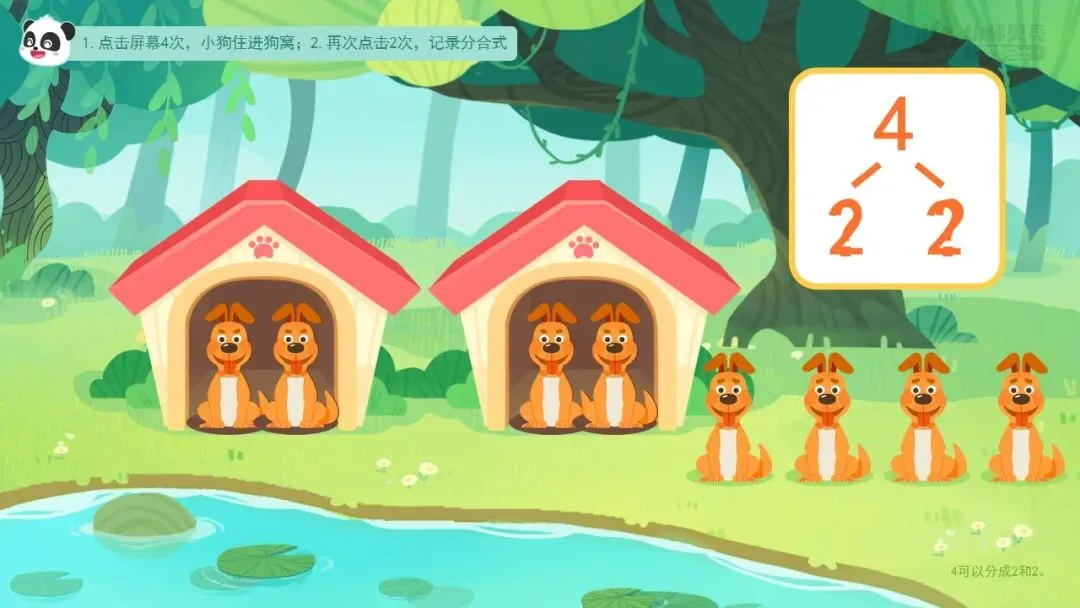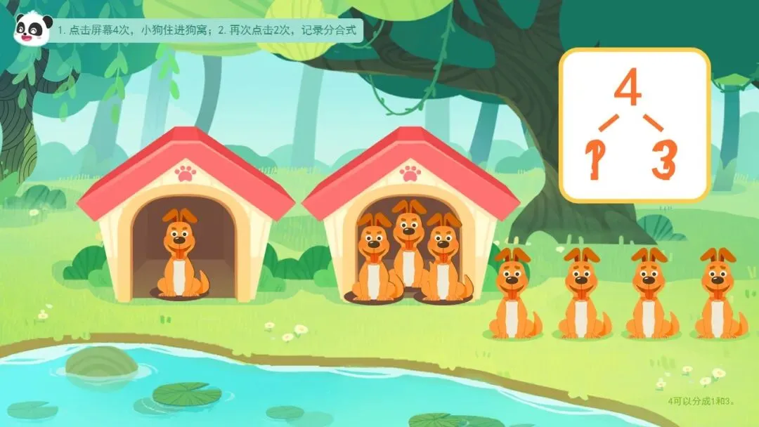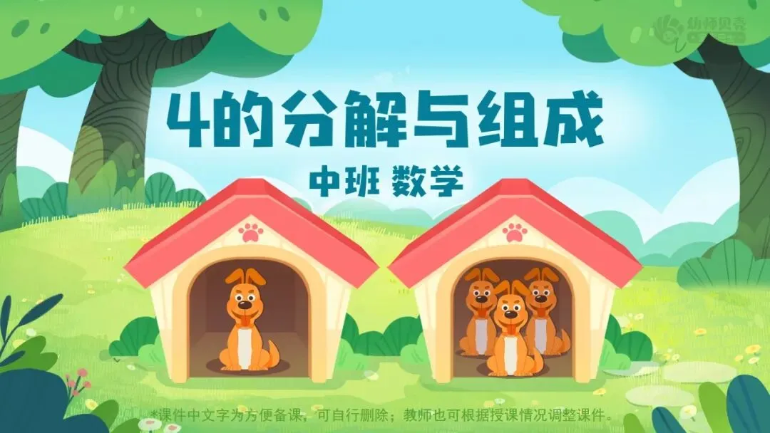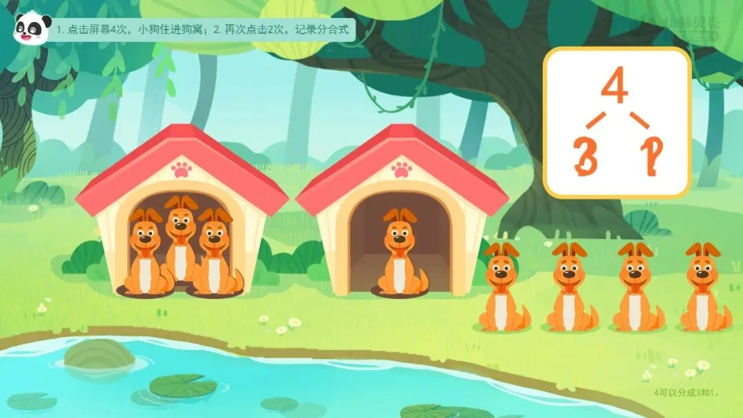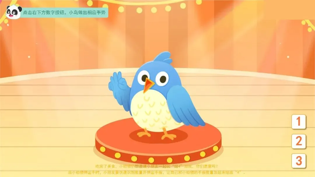 ——当小动物伸出手时,小朋友要快速识别数量并伸出手指,让自己和小动物的手指数量加起来组成“4”。