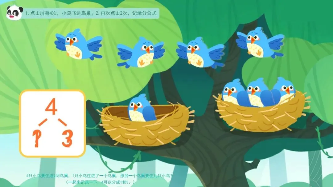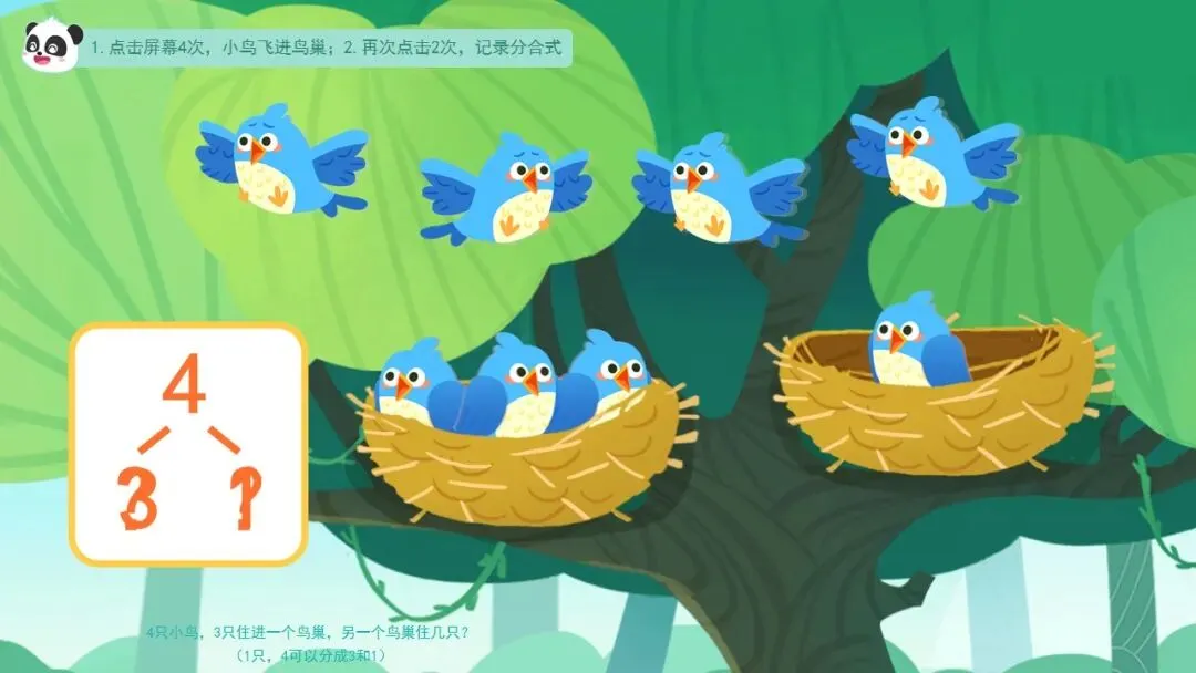 ——4只小鸟,3只住进一个鸟巢,另一个鸟巢住几只?(1只,4可以分成3和1)