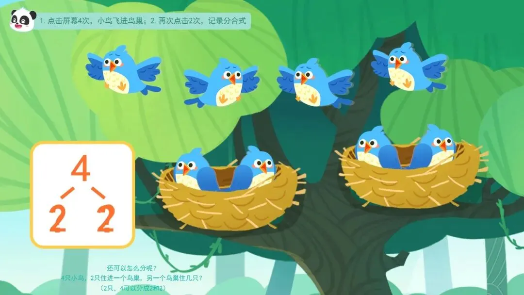 ——4只小鸟,2只住进一个鸟巢,另一个鸟巢住几只?(2只,4可以分成2和2)