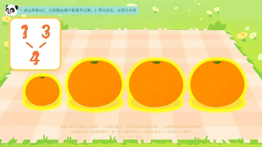 ——小动物们送来了甜甜的橘子,数一数小橘子有几个?大橘子有几个?总共有几个橘子?(1个;3个;4个)