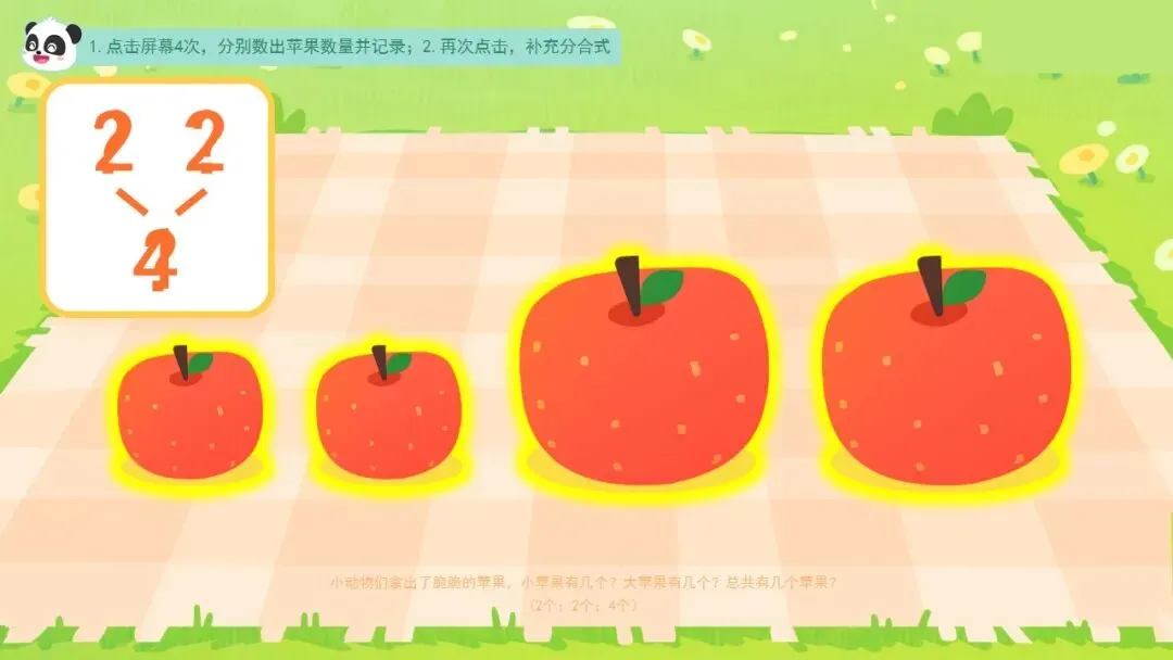 ——小动物们拿出了脆脆的苹果,小苹果有几个?大苹果有几个?总共有几个苹果?(2个;2个;4个)