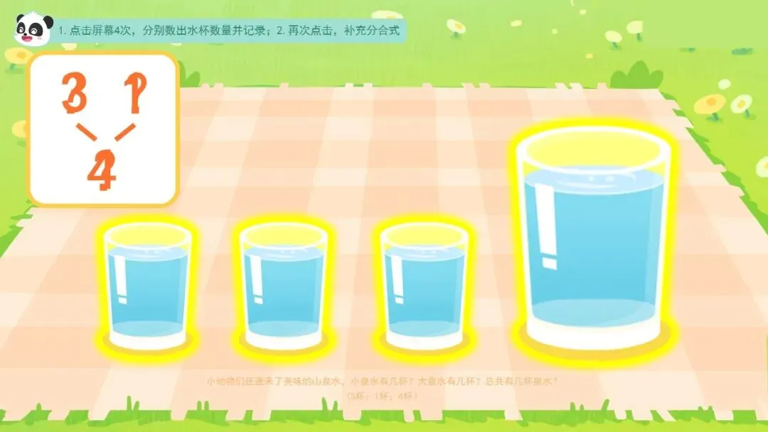 ——小动物们还送来了美味的山泉水,小泉水有几杯?大泉水有几杯?总共有几杯泉水?(3杯;1杯;4杯)
