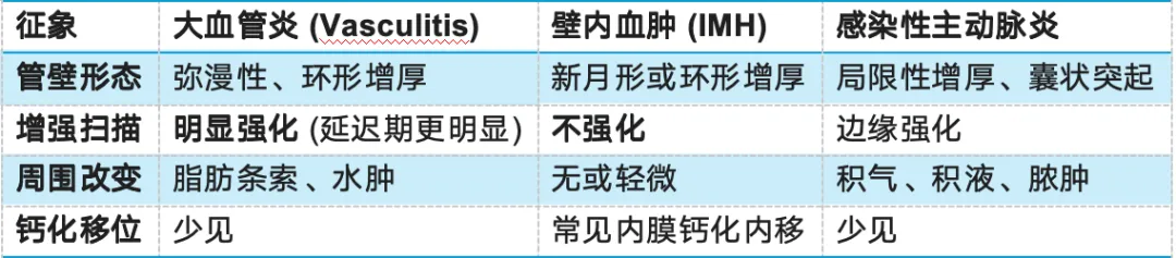 面对 CT 上显示的“主动脉壁环形增厚 + 强化 + 周围渗出”,结合患者的高炎症指标,我们需要迅速鉴别诊断。