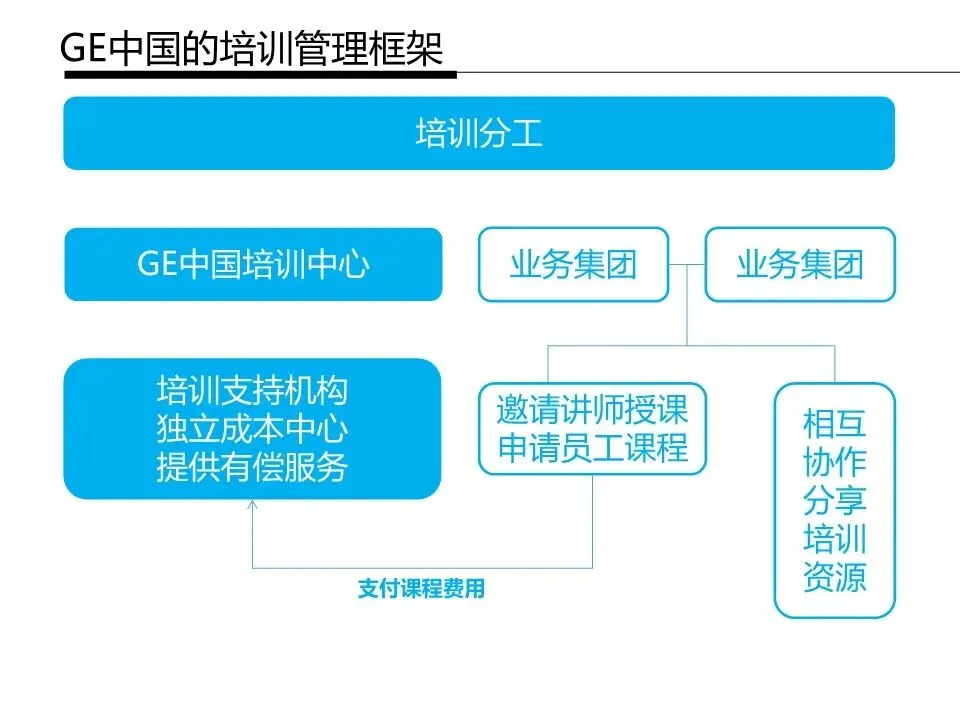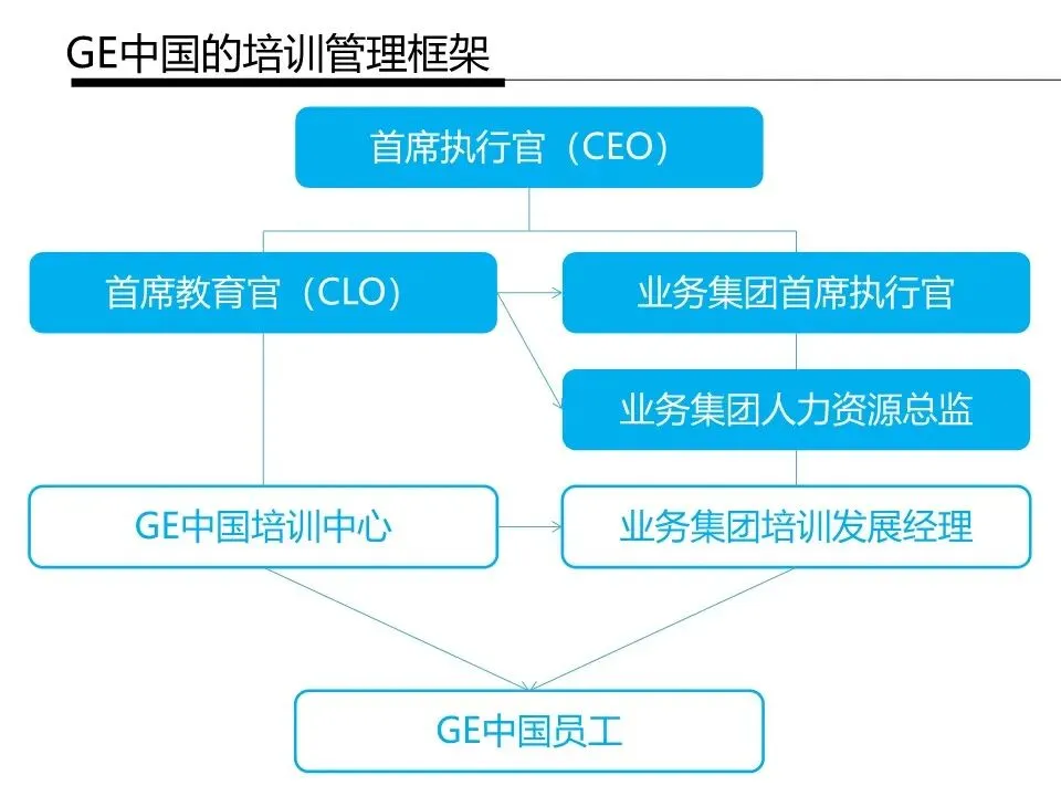GE 通用电气中国构建了一套架构清晰、分工明确且聚焦战略与实战的培训体系,以上海的 GE 亚洲培训与发展中心和各业务集团为核心双向并行开展培训,既传承了 GE 全球成熟的培训理念,又结合本土业务做了适配调整,以下是具体解析: