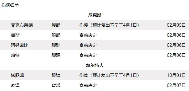 兄弟们,昨天的公开课好评,这场独行侠和马刺的二番战基本第一节就奠定了对攻的基调!公开课近37场好评24场!上锁课件里,灰熊对了,掘金对了,可惜老鹰和骑士相继让人失望!明天隔壁那屋超级碗决赛!所以NBA只有四场比赛,并且都在北京时间凌晨!我们还是5个方向,一起来看!竞篮看的是长线,任何时候都要踏踏实实,一步一个脚印,结合篮球层面和指数层面双管齐下,为大家带来更精细的内容分享!部分下午场和晚场的比赛由于时效性,我们一般发布在朋友圈,没添加洋哥VX的兄弟可以拖到文章下方识别二维码添加!朋友可以点击下方公众号卡片关注一下洋哥,每天都有免费的比赛分享发在公众号里!今日私厨:凯尔特人通过交易引进武切维奇,目的是补强内线进攻。克塔防守尚可但进攻薄弱,武切维奇虽进攻略胜一筹,防守却存在明显短板。目前球队进攻主要依赖怀特、布朗和普理查德,交易走小西蒙斯后,轮换得分能力有所下滑。尽管武切维奇仍在磨合期,但防守端的漏洞难以让人信任。迈克·布朗执教下的尼克斯表现起伏不定,稳定性不足。球队进攻主要依靠布伦森,唐斯状态不稳导致进攻压力集中在布伦森身上。轮换阵容中还有内线防守大将米罗和具备持球进攻能力的克拉克森,阵容实力不俗。与前任锡伯杜侧重防守不同,布朗主打动态进攻,这场比赛数据低开是基于凯尔特人出色的防守能力,不过考虑到两支球队都有不错的进攻武器,而凯尔特人补充武切维奇后护框和防守质量是有所下降的,综合考虑本场比赛看好双方进攻大战。更多精彩赛事分享