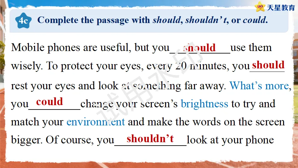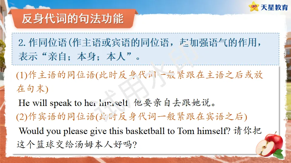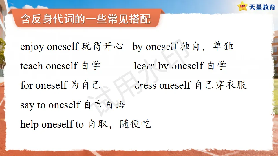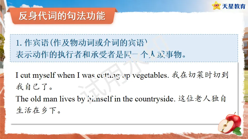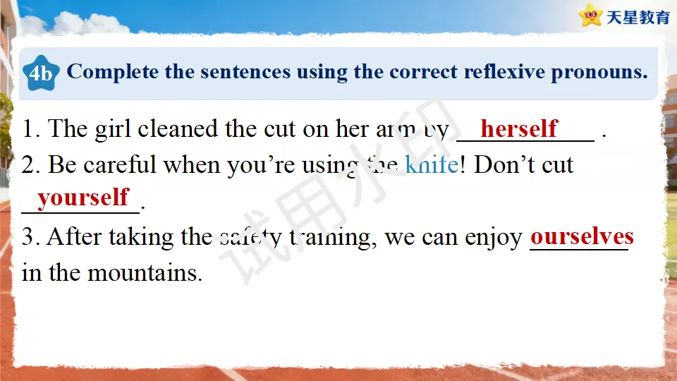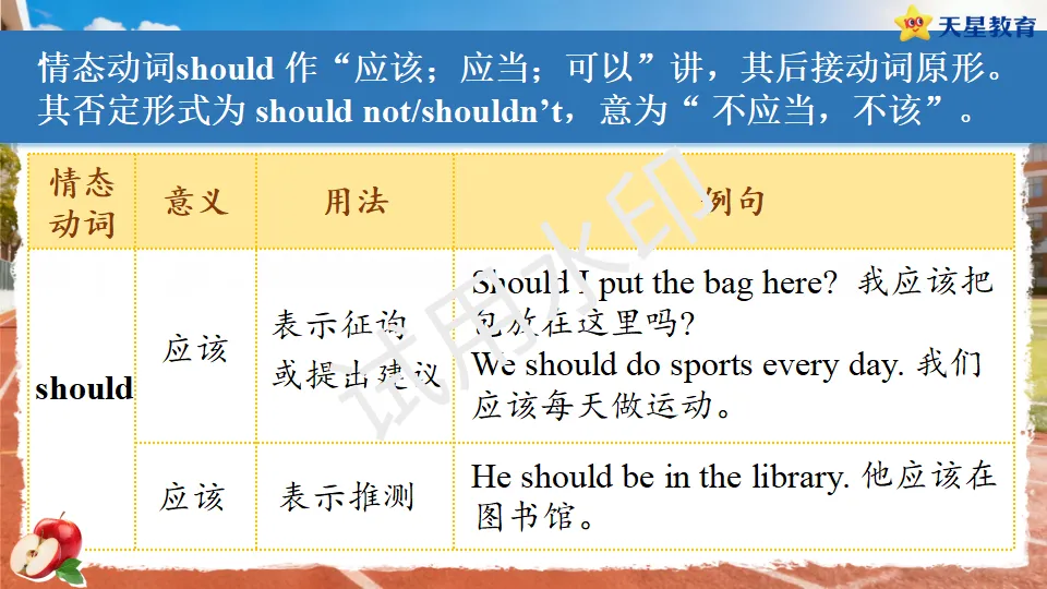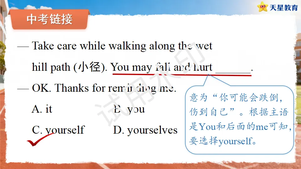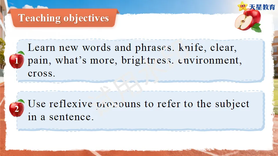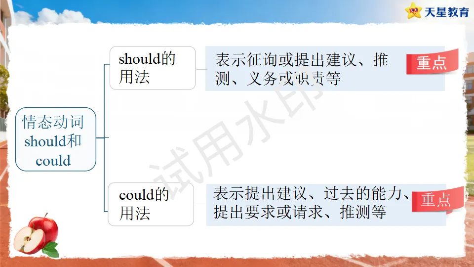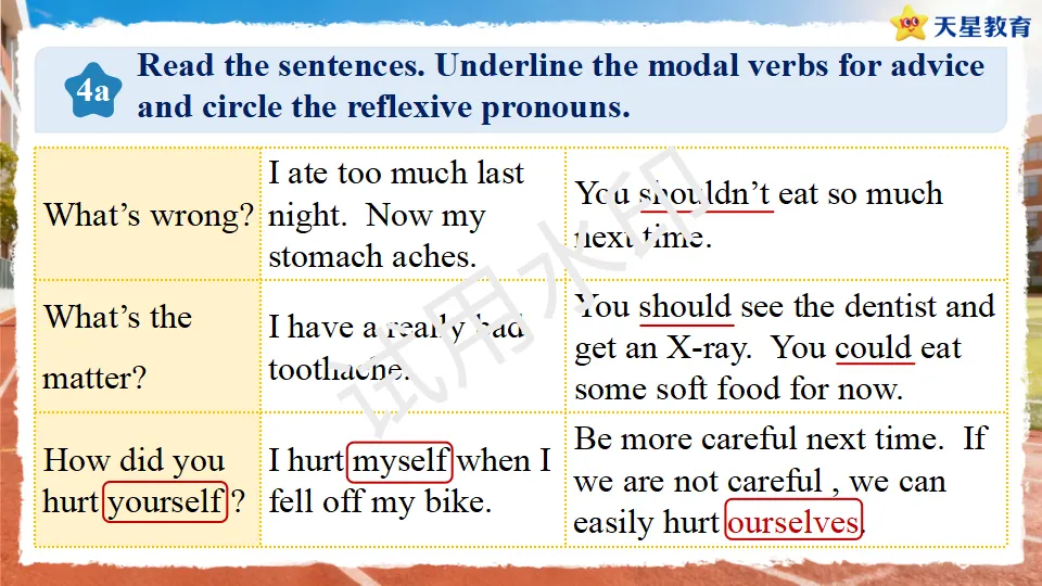 课件教学目标明确,既能让学生掌握“knife、clear”等新单词短语,更能重点突破情态动词should/could、反身代词的用法。通过表格对比、例句解析拆解复杂语法,搭配中考真题演练,帮学生吃透考点、应对考试。