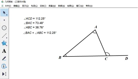 验证:利用几何画板演示三角形的外角和它不相邻的两个内角和相等.