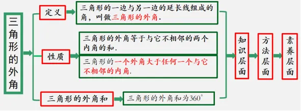 (1)三角形的外角等于与它不相邻的两个内角的和.(由三角形内角和得出的推论)