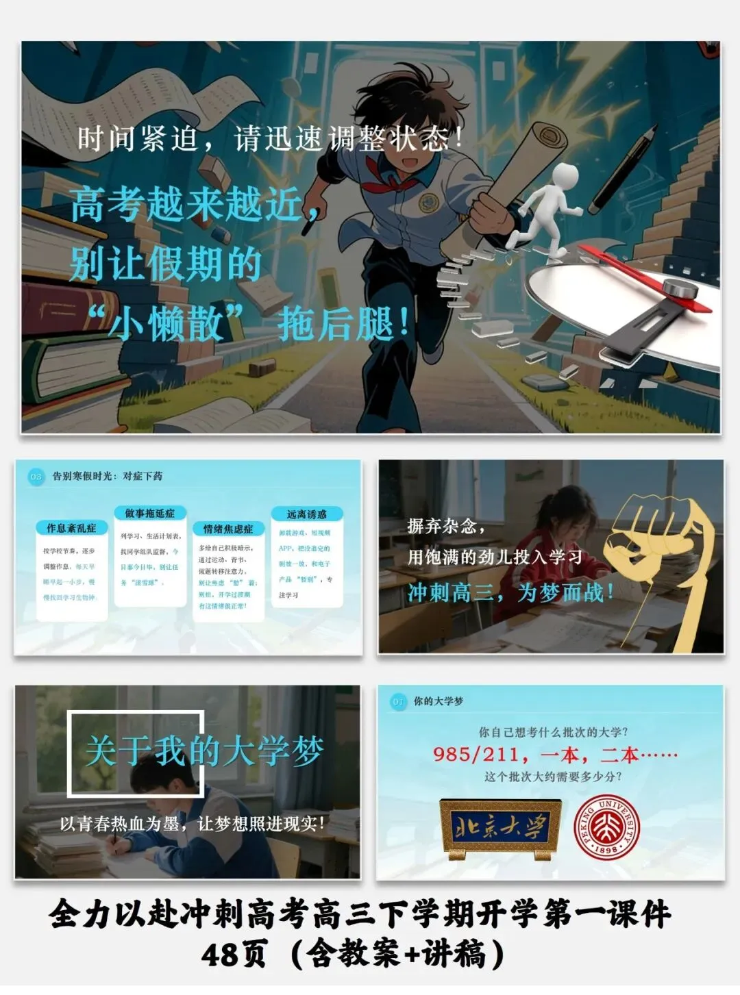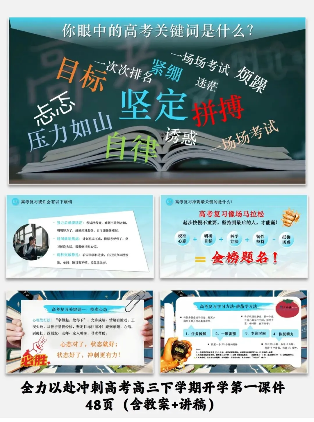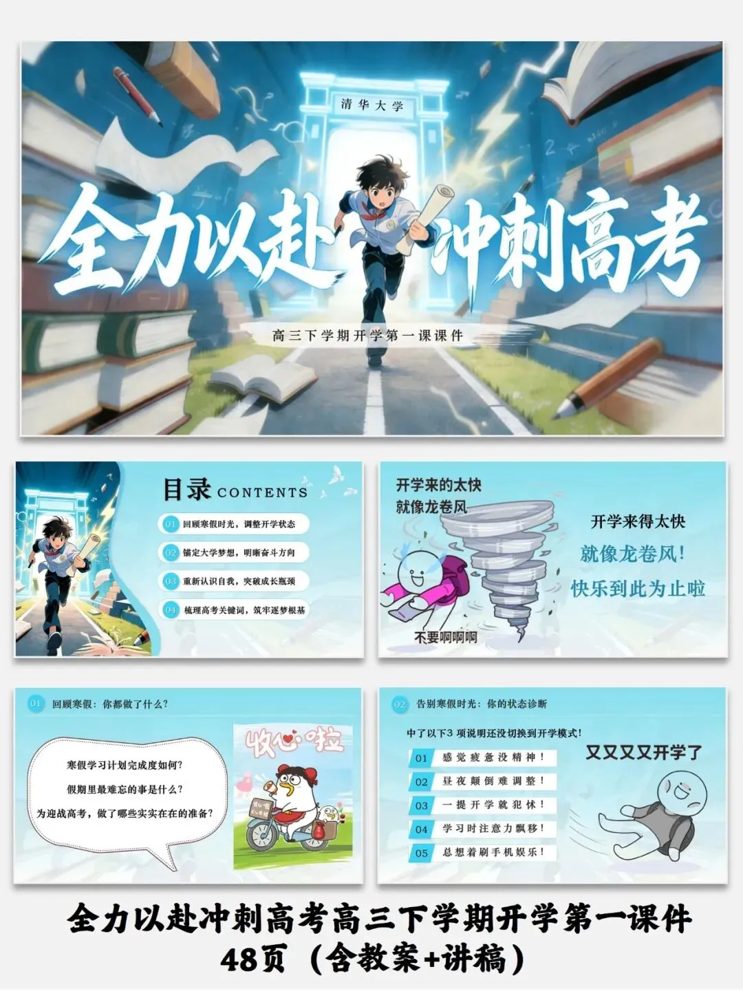 紧扣高三备考需求,从收心调整、锚定梦想、突破瓶颈、梳理重点四维度设计,助力学生高效冲刺高考。全力以赴冲刺高考高三下学期开学第一课件48页(含教案+讲稿)