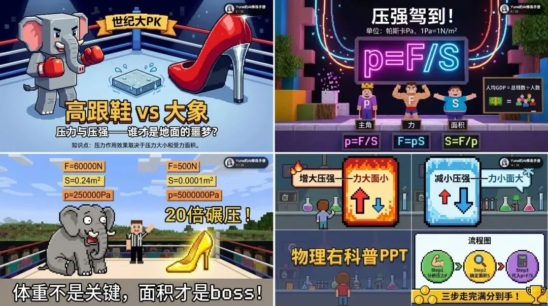 "同学们好!欢迎来到'梗王'老师的物理课堂。今天我们要搞清楚一个让人细思极恐的问题——如果你是一块地板砖,你更怕被大象踩,还是更怕被穿高跟鞋的阿姨踩?"
