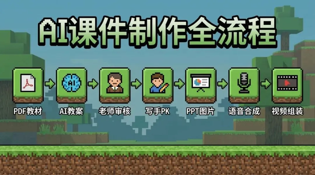 1. 得先吃透教材内容,写出教案2. 教案得有人审核,不能有知识错误3. 得把教案变成PPT脚本(讲什么、怎么讲、配什么图)4. 得生成PPT页面图片5. 得加上品牌水印6. 得录旁白语音7. 得把图片和语音组装成视频,还得加字幕