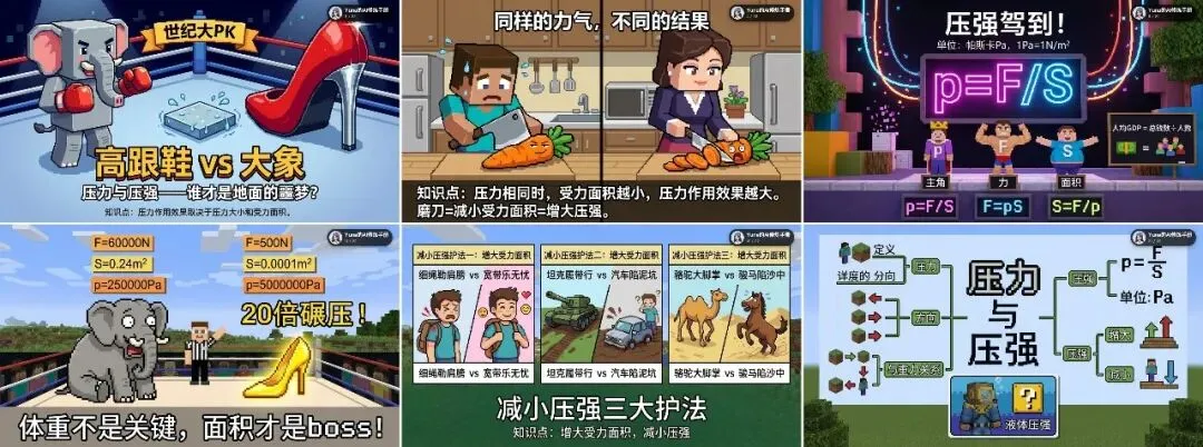 • 把压强比作"物理界的人均GDP"——总压力有多大不重要,关键看平均到每平方米上有多大• 把增大压强的例子封为"增大压强四大天王":刀刃、图钉、冰刀、啄木鸟• 把减小压强的例子叫"护法天团":宽书包带、坦克履带、骆驼脚掌